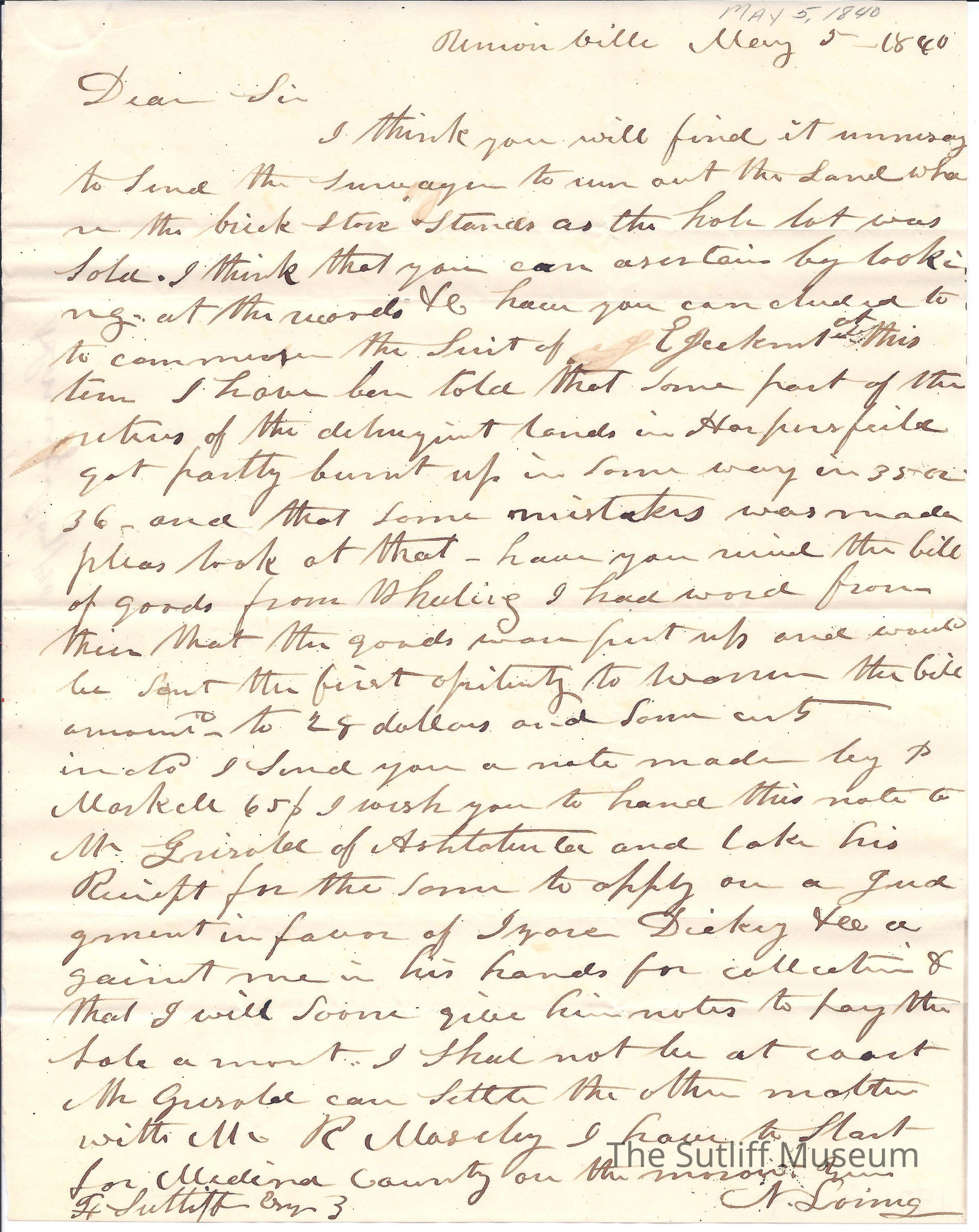 Letter from N Loring to Flavel Sutliff. He is a client who has questions about a land judgment in Harpersfield.