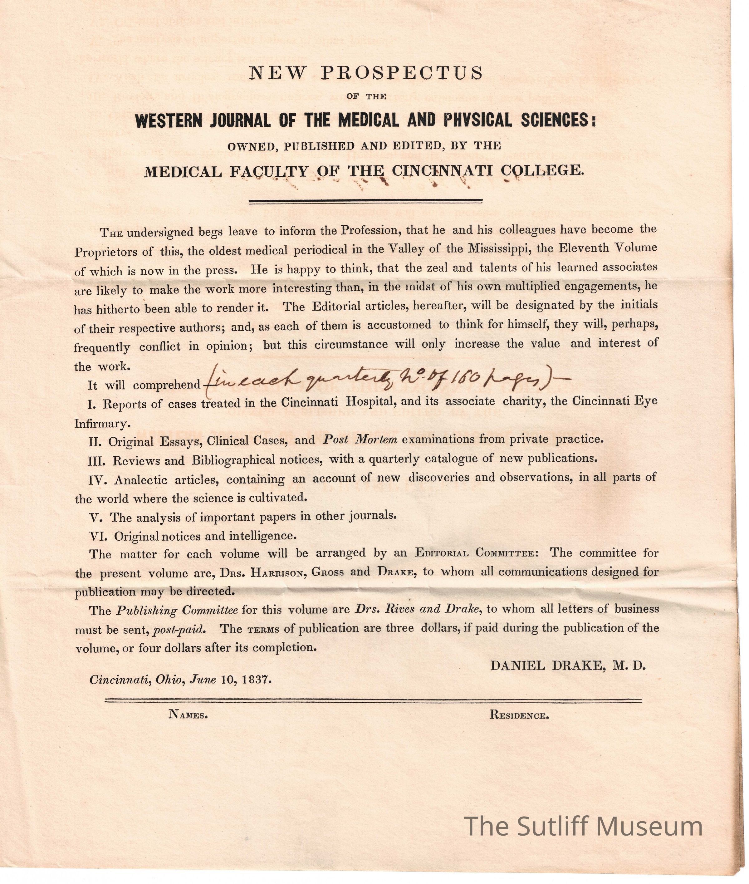 A document titled "New Prospectus of the Western Journal of the Medical and Physical Sciences: Owned, Published and Edited, by the Medical Faculty of the Cincinnati College" that makes it known what they will publish.Relationships