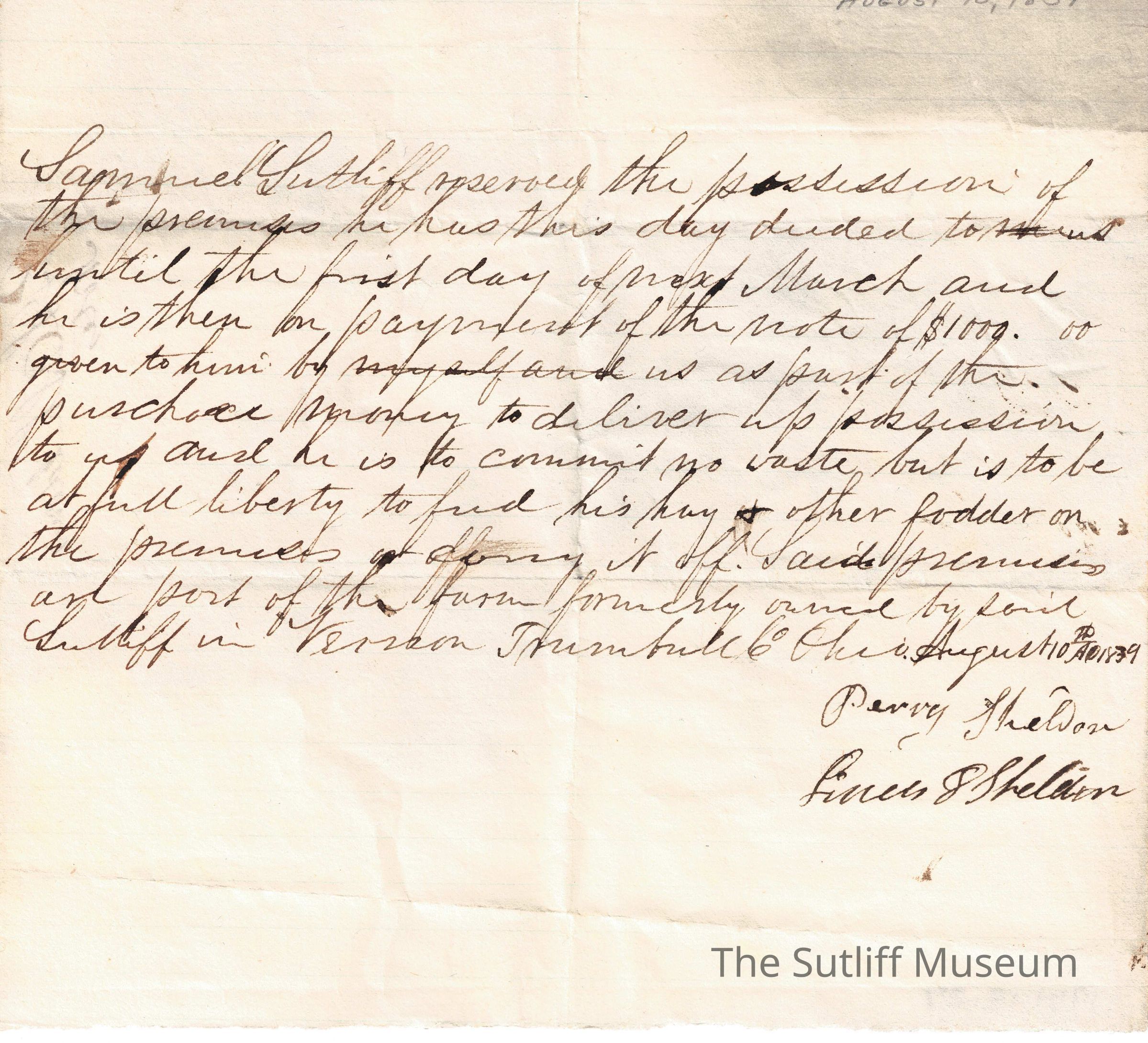 A note from Perry and Linus Sheldon regarding the promise from Samuel Sutliff to pay for the deeded land.Collection
