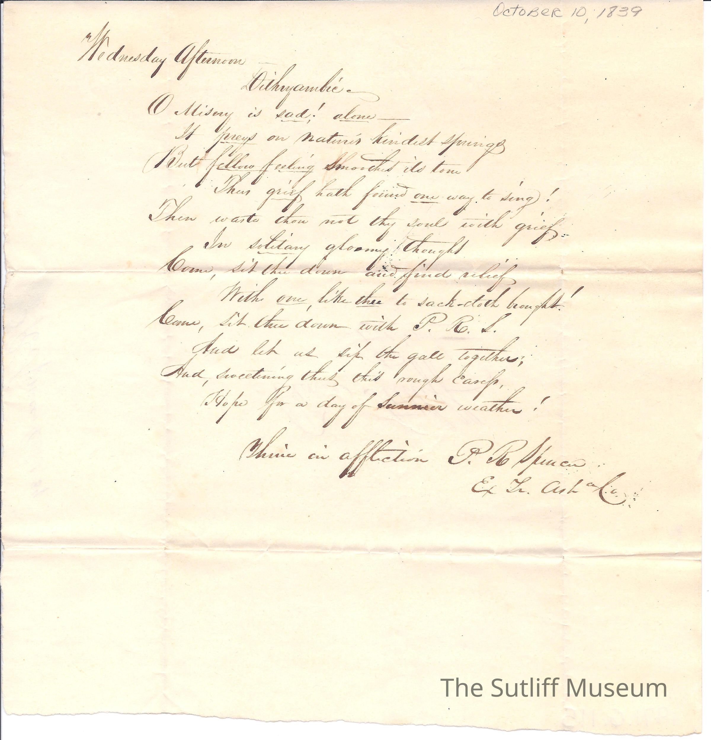 A poem written from P.R. Spencer to Flavel Sutliff about grief.