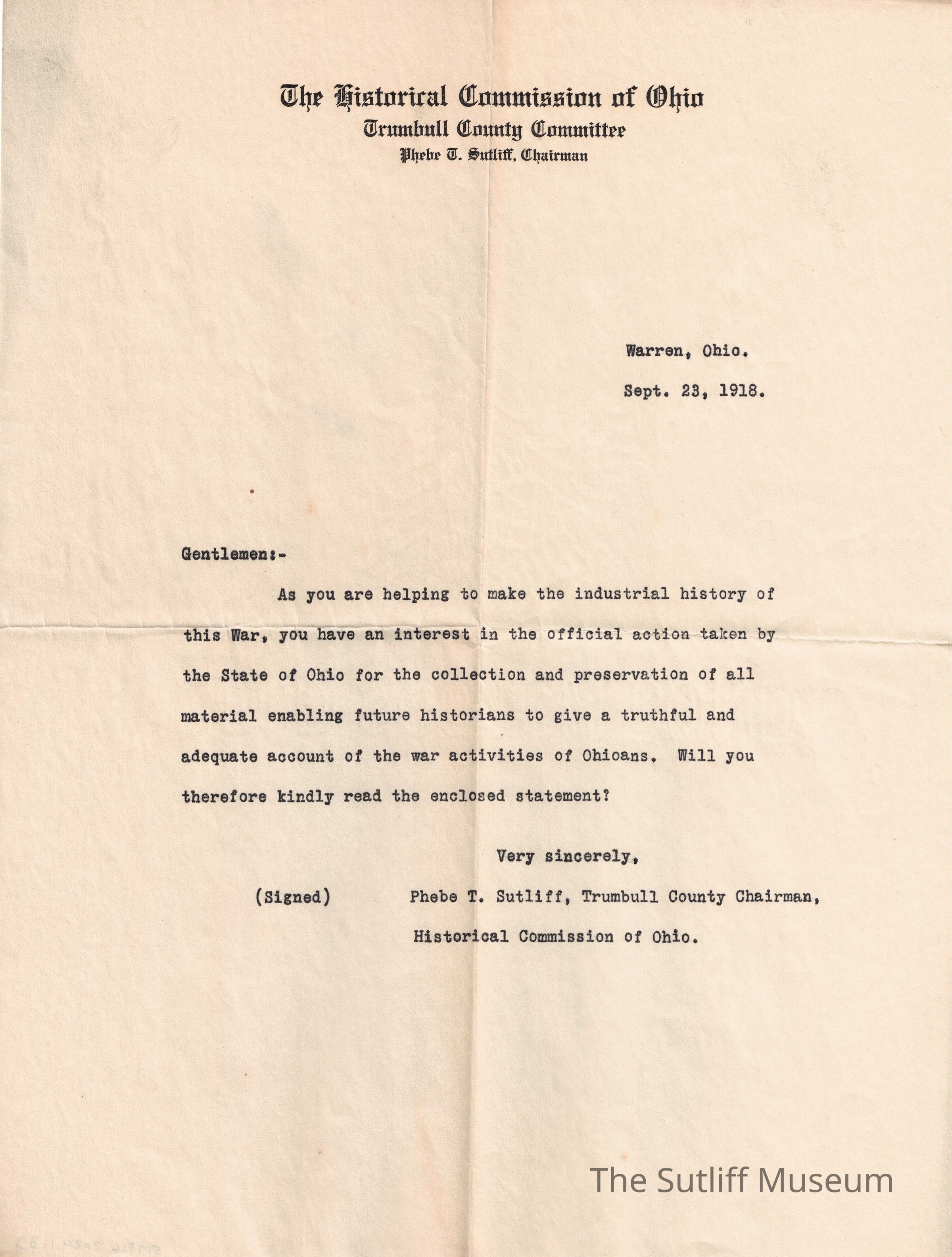 A letter from Phebe Temperance Sutliff to the Historical Commission of Ohio asking them to read her enclosed statement.Relationships