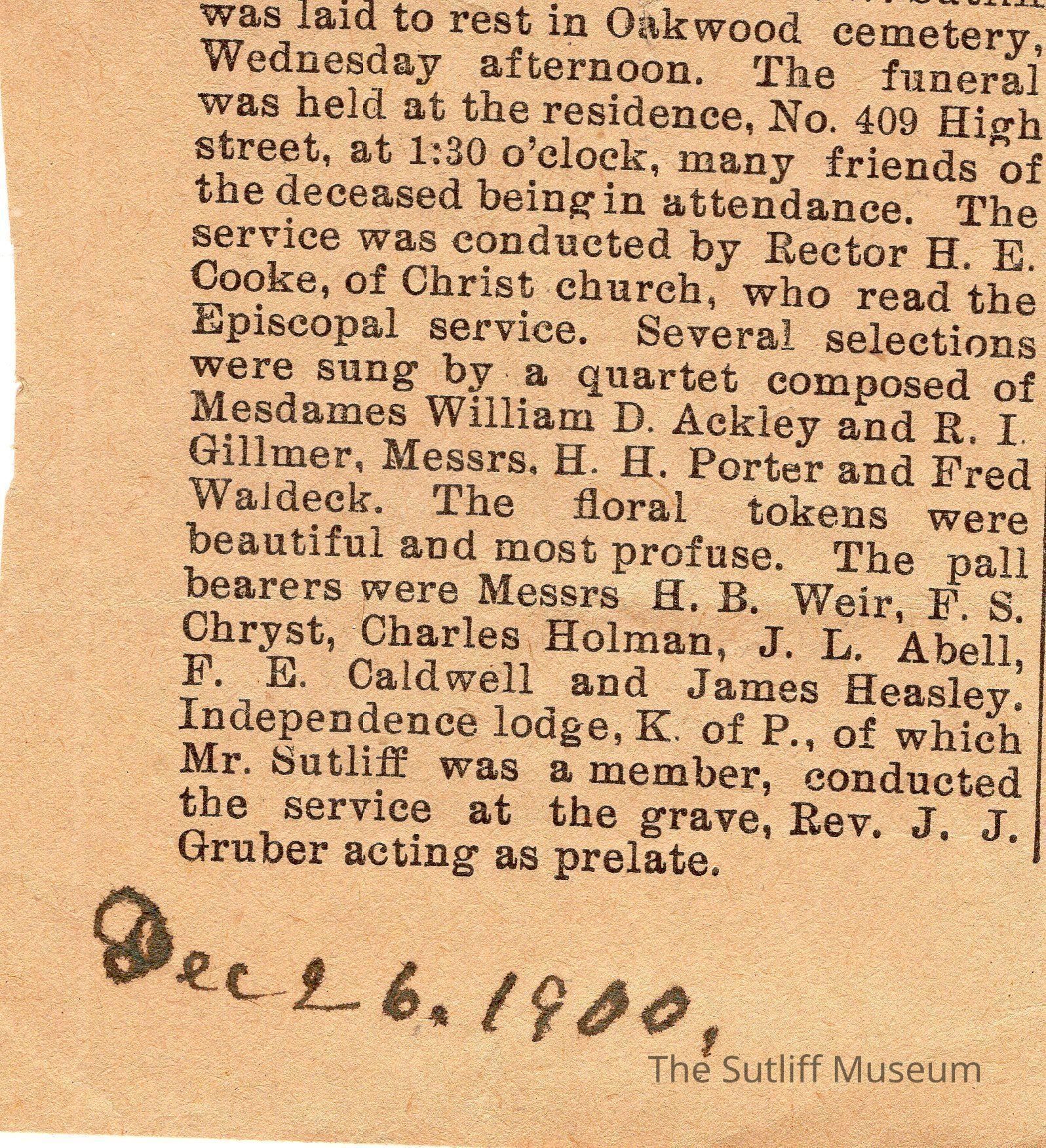Newspaper clipping about the death of Plumb W. Sutliff and where he was laid to rest. December 26, 1900.Archive Details