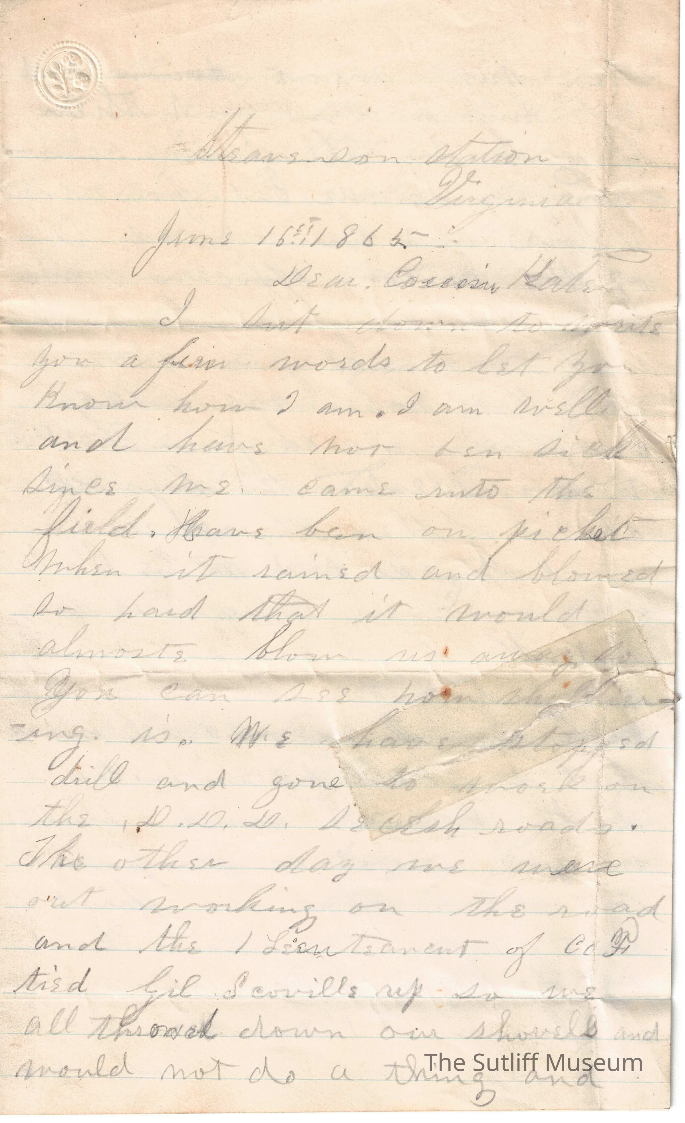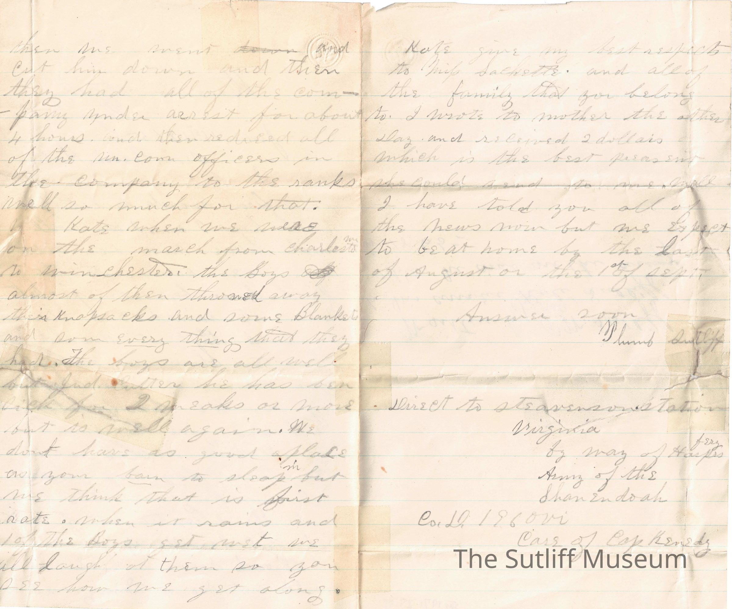 A letter from Plumb W. Sutliff to his cousin Kate Sutliff, which was written while he was in the army during the Civil War.Relationships