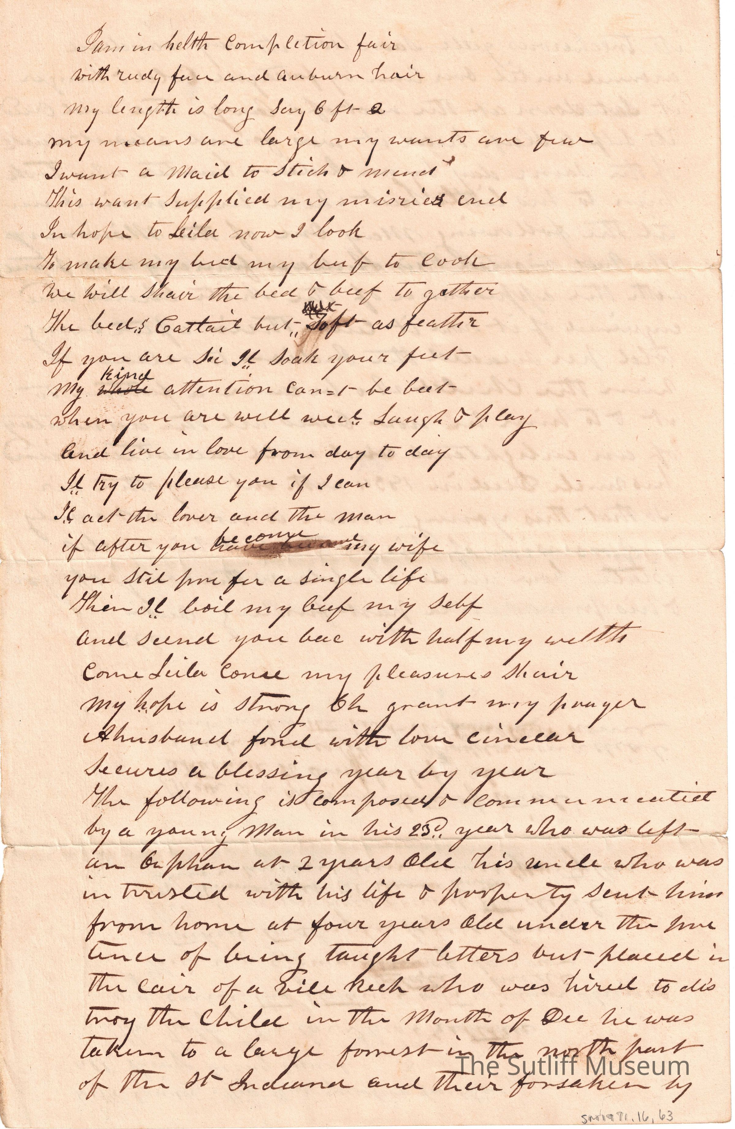 Poetry signed by "M" composed and communicated by a young man in his 23rd year.