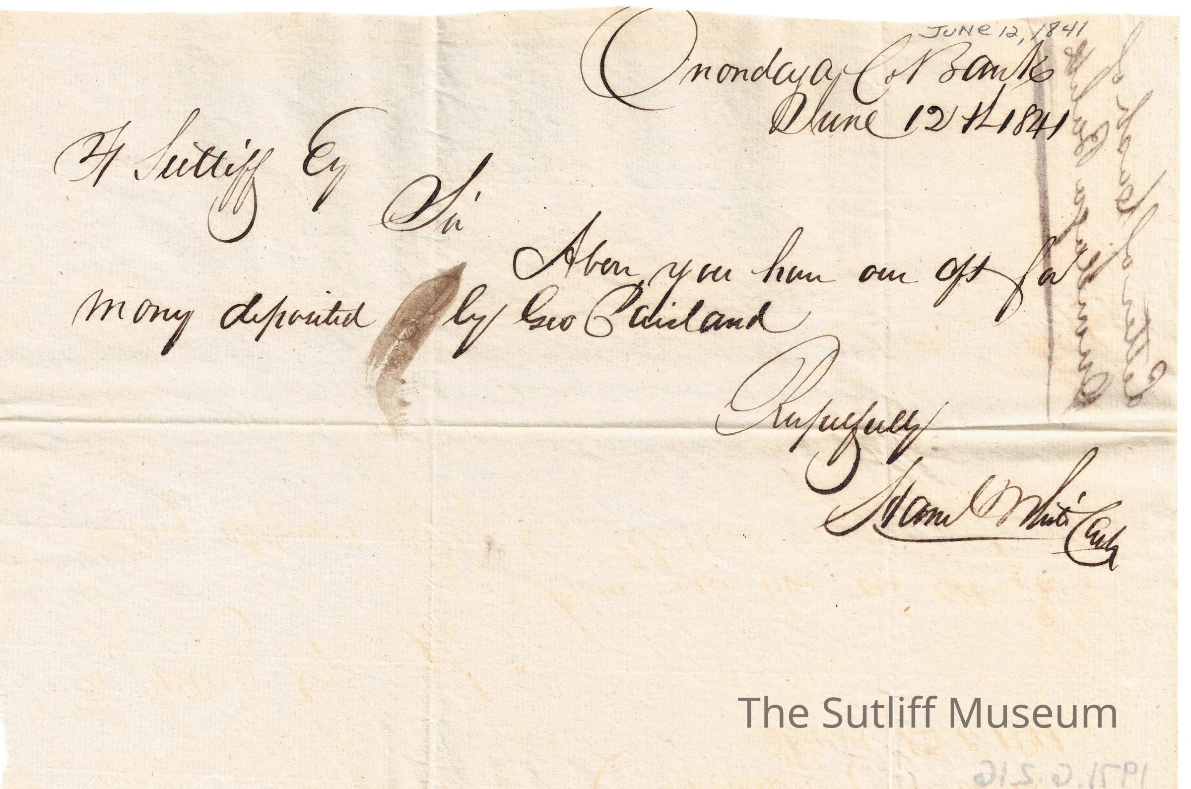 Letter from [?] to Flavel Sutliff as payment for [?].