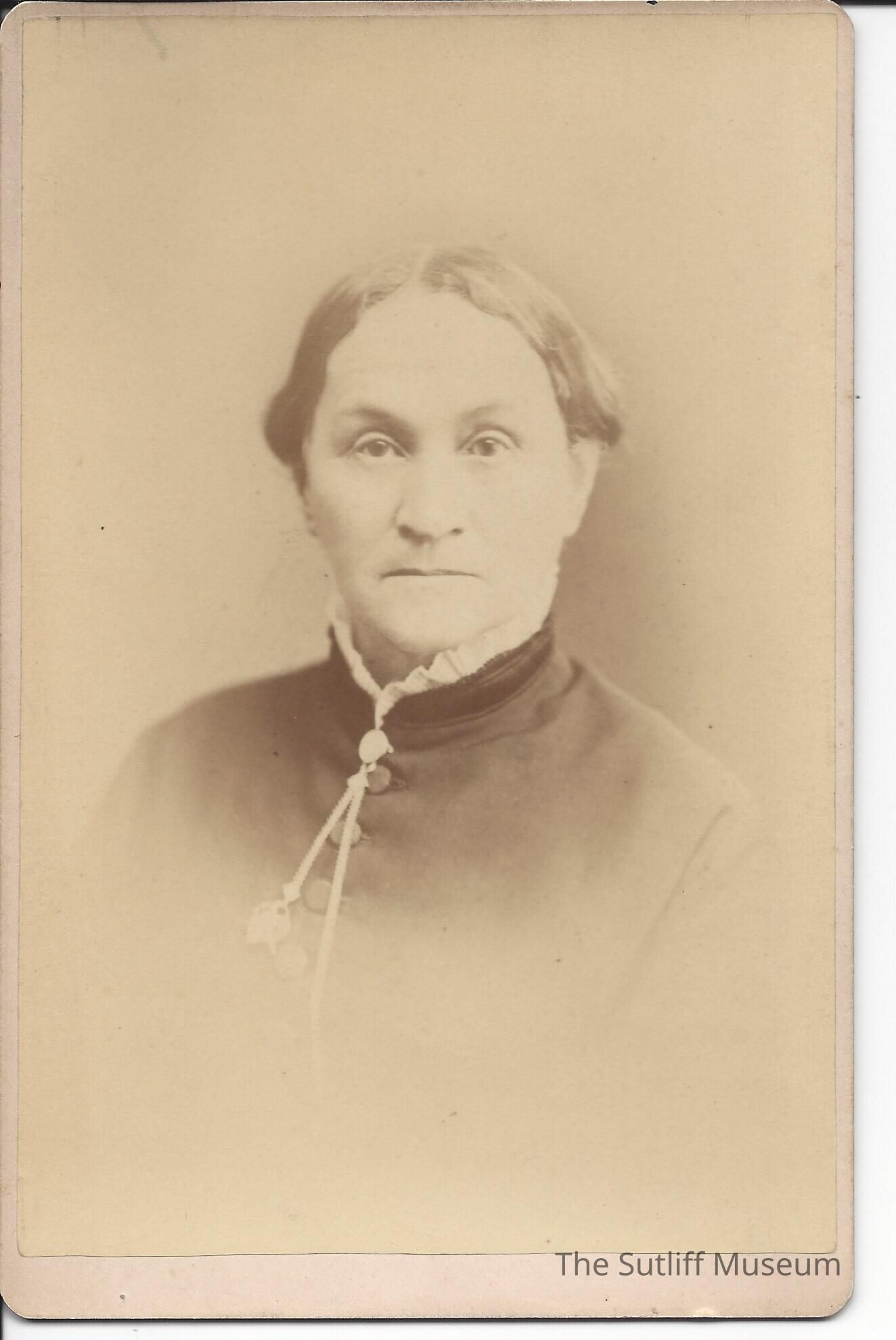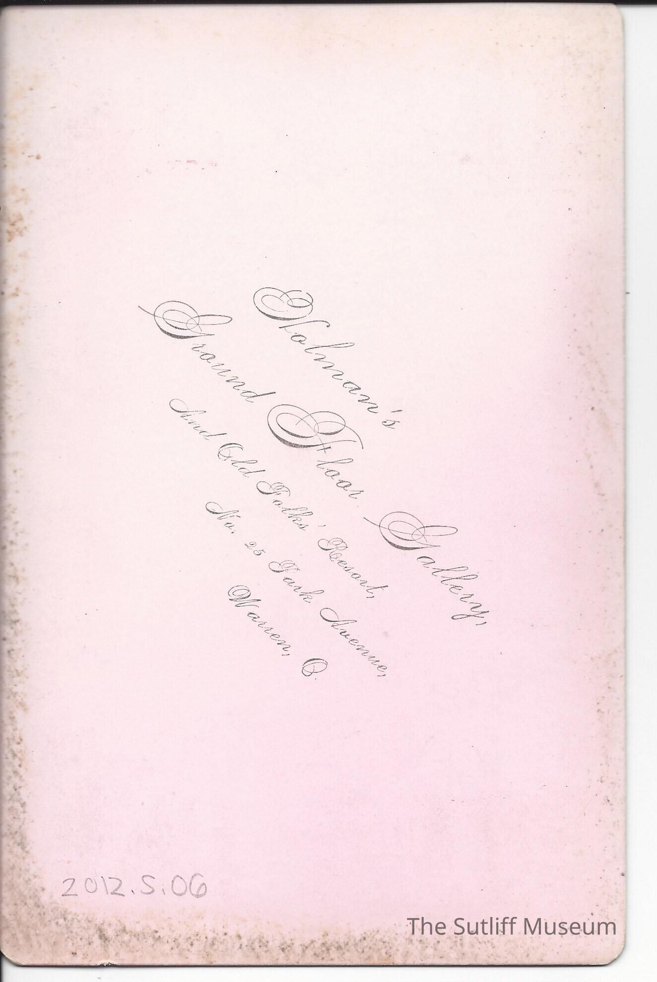 The item is a photograph portrait of Phebe Sutliff. It is sepia toned and Phebe is wearing a blouse or dress and her hair is pinned up. The photograph was taken by Holman, Park Avenue, in Warren, Ohio. The photographer's information is listed on the back.Collection