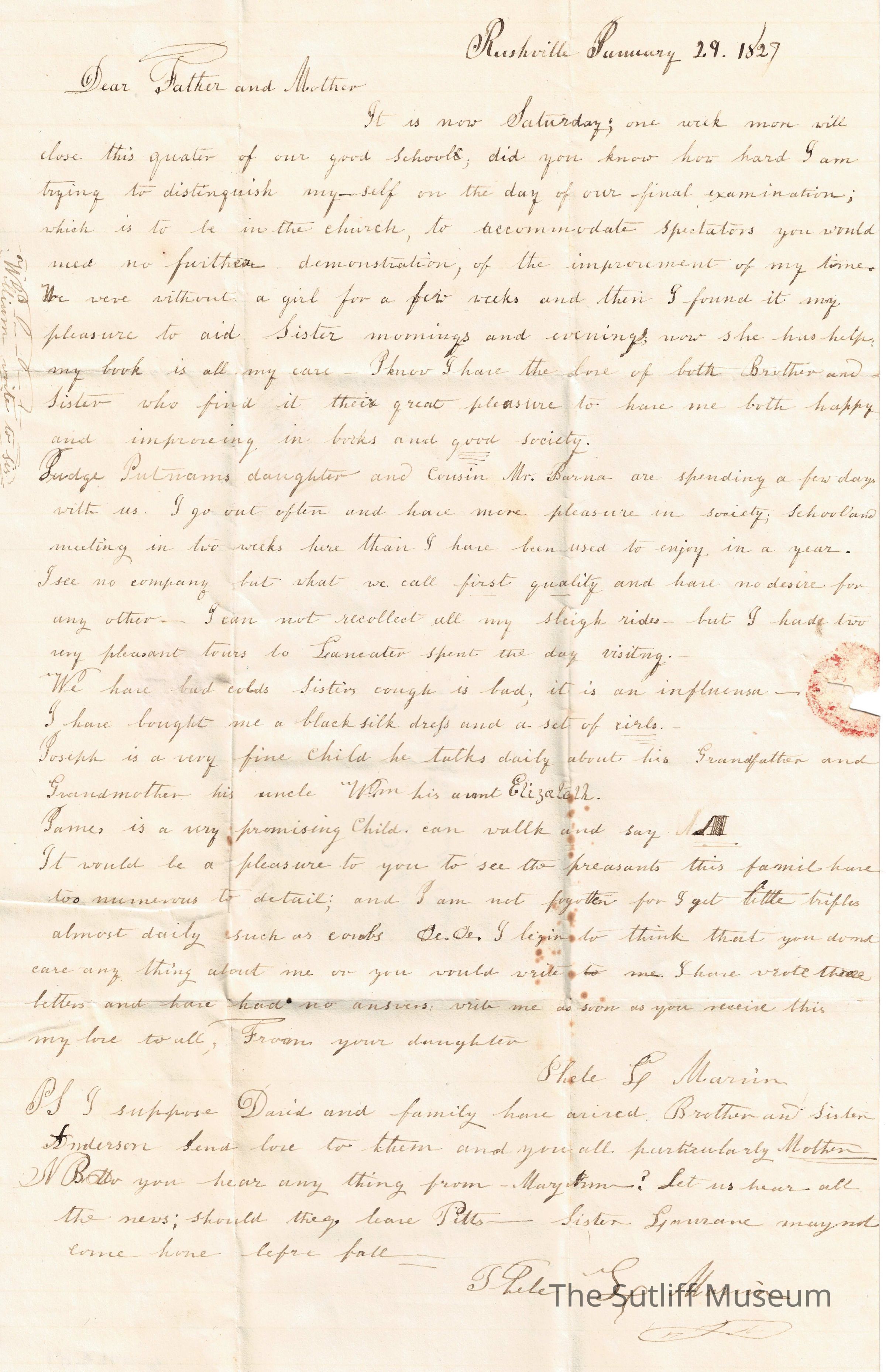 A letter from Phebe Lord Marvin Sutliff to her parents regarding her siblings and other family updates.Collection