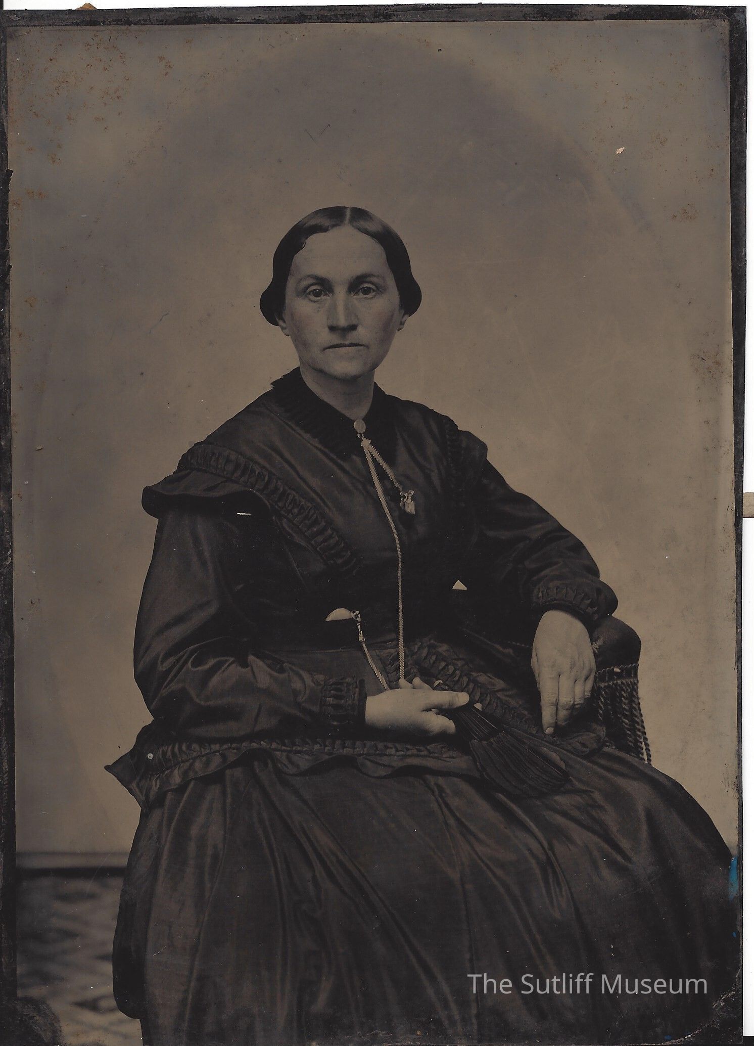 The photograph features a woman seated in an ornate wicker chair, dressed in a dark, voluminous 19th-century gown with detailed ruching and pleating. She wears somber expression with her hands positioned gently in her lap, one holding a fan. Her attire is complemented by a distinct, long necklace that falls to her waist, decorating her otherwise plain dress. This sepia-toned image, showing some signs of age and wear, captures an essence of bygone elegance.