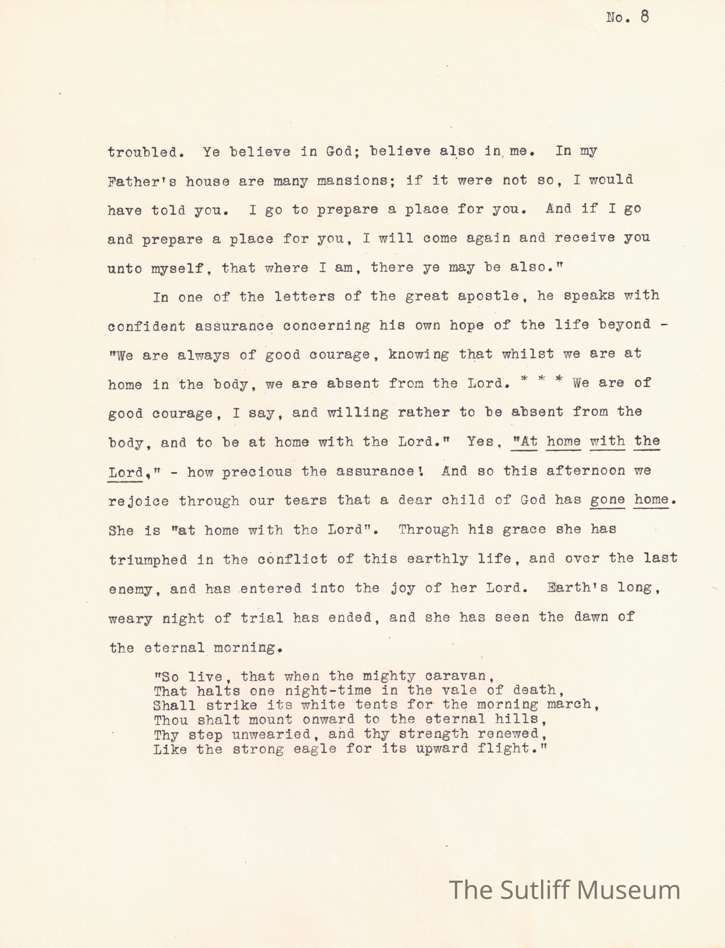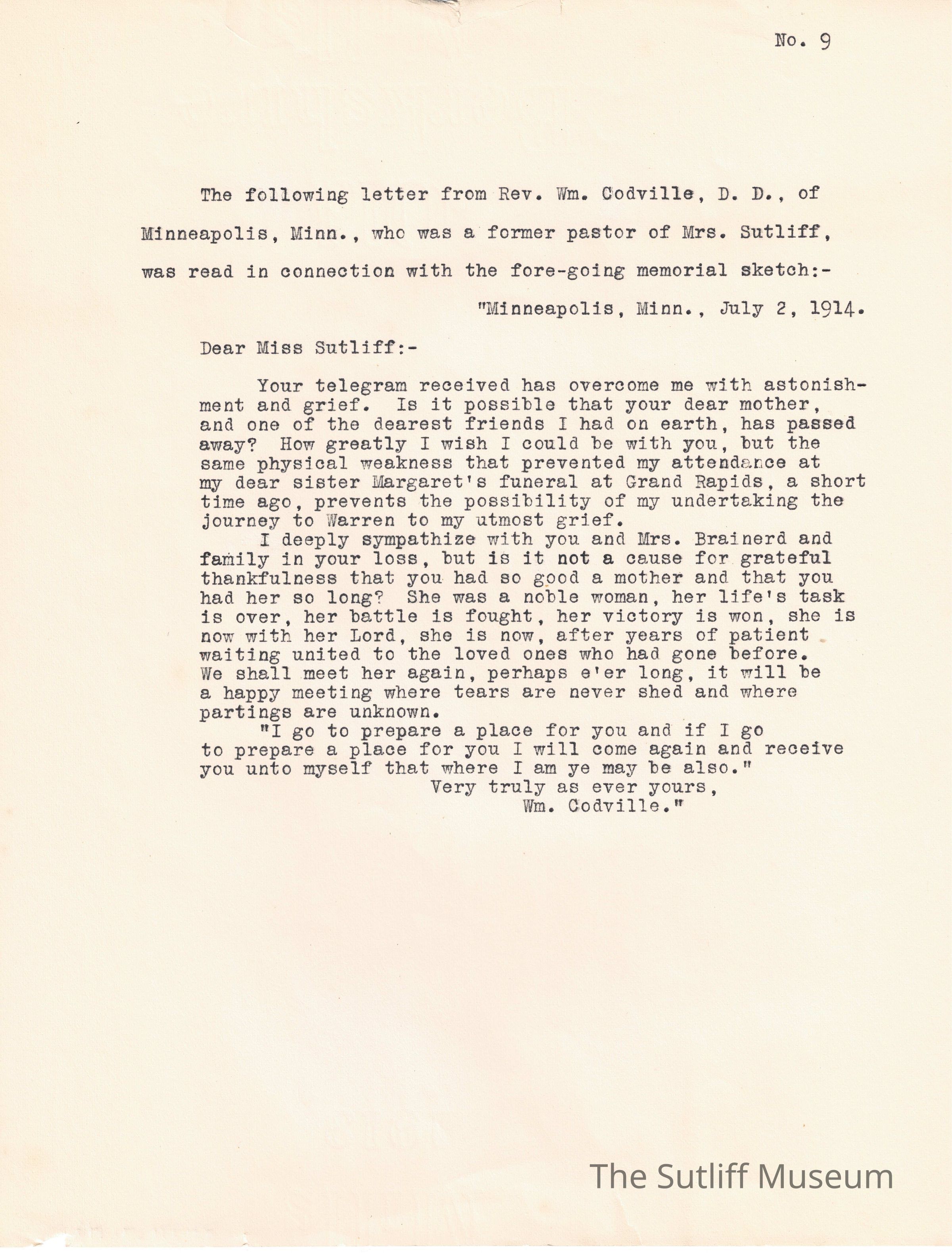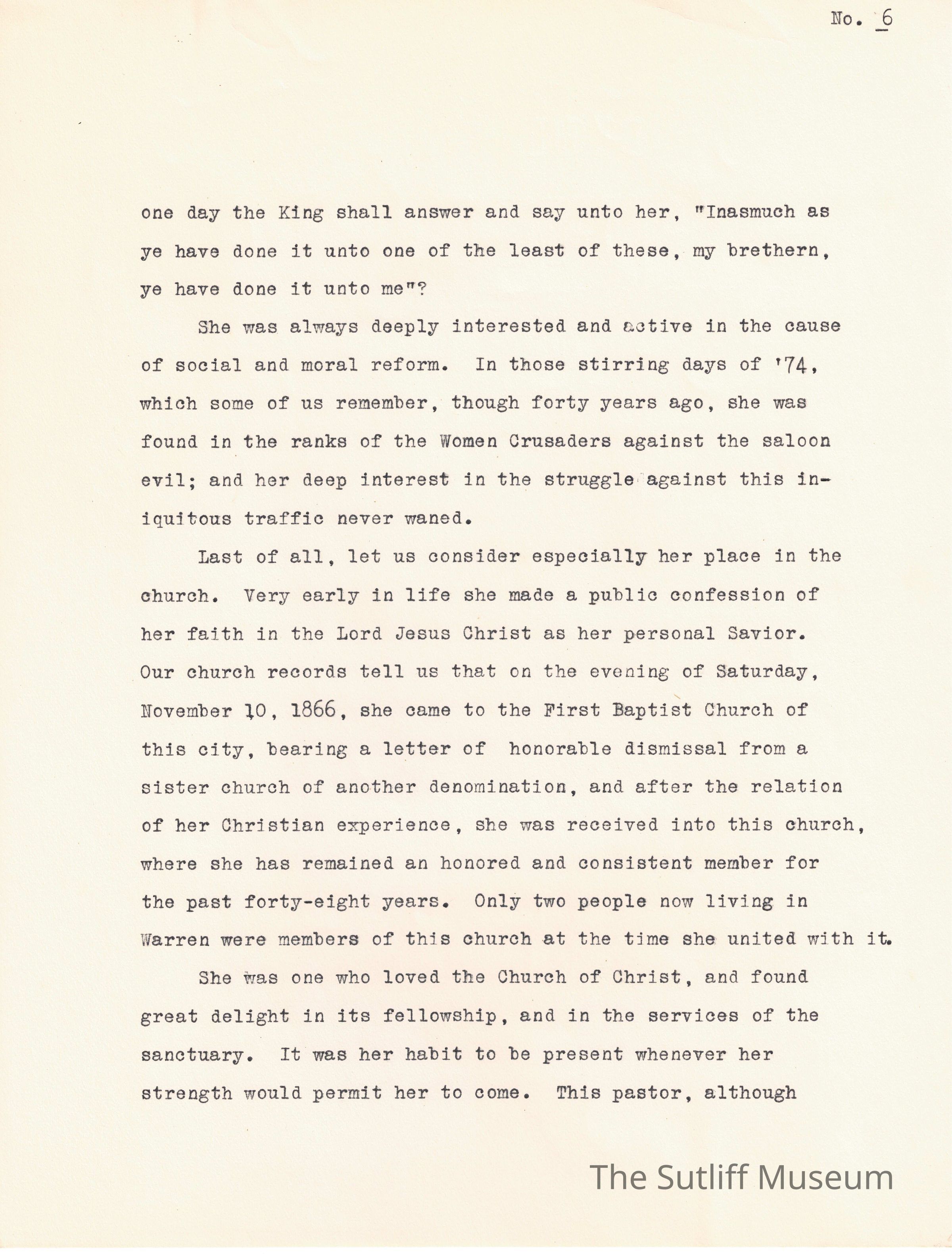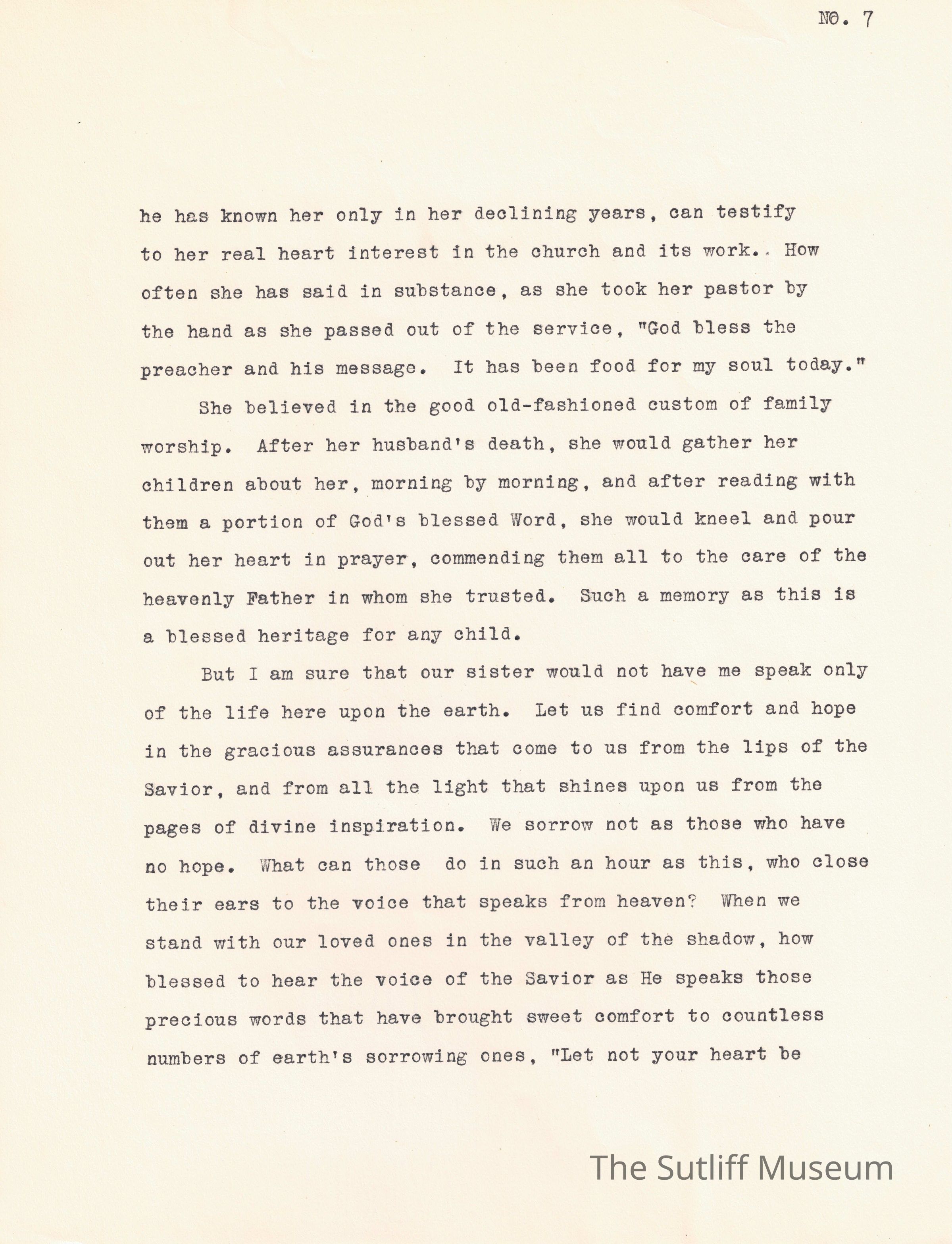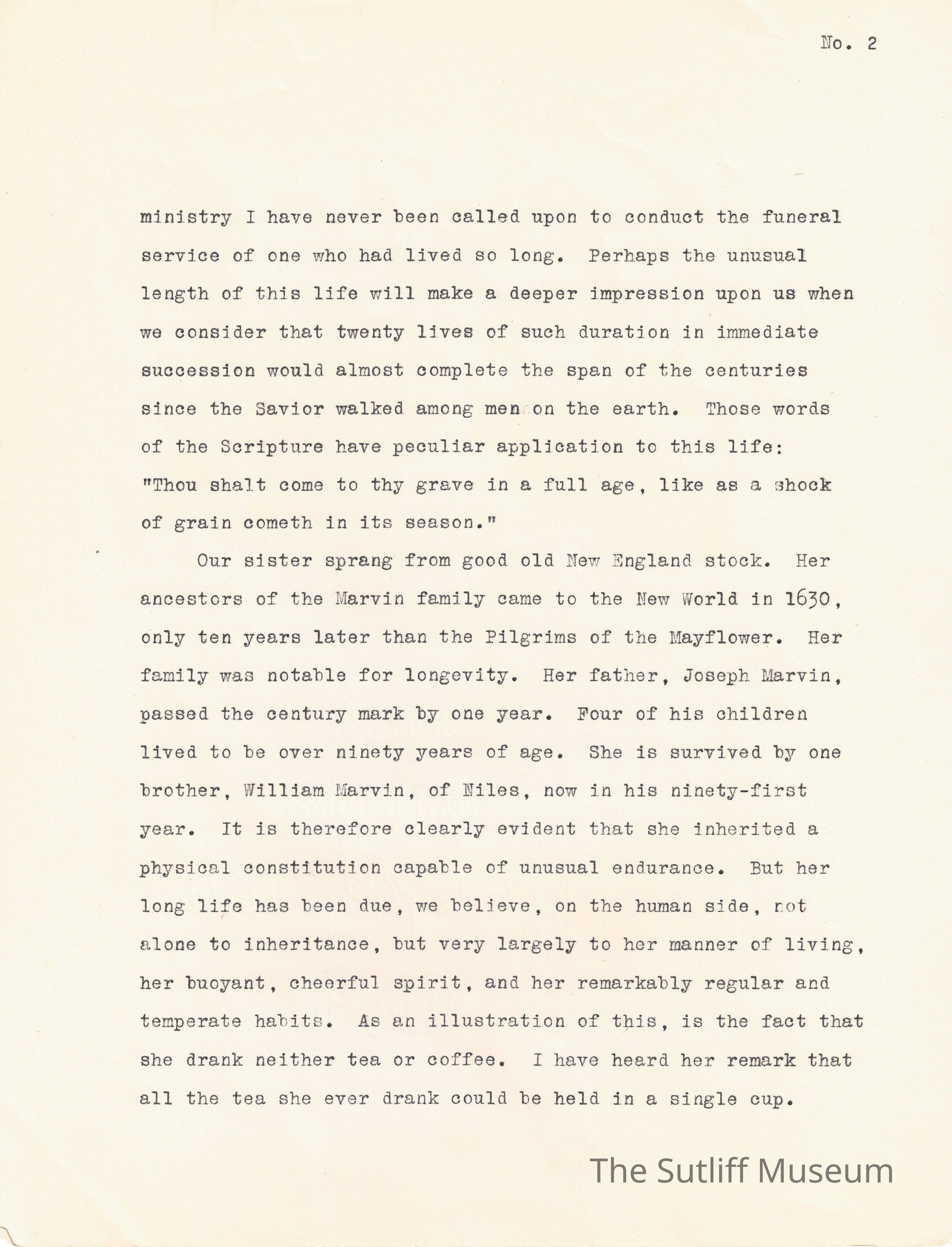 A written documentation of Phebe Lord Marvin Sutliff's funeral service conducted by pastor William E. Barker on July 5, 1914.Collection