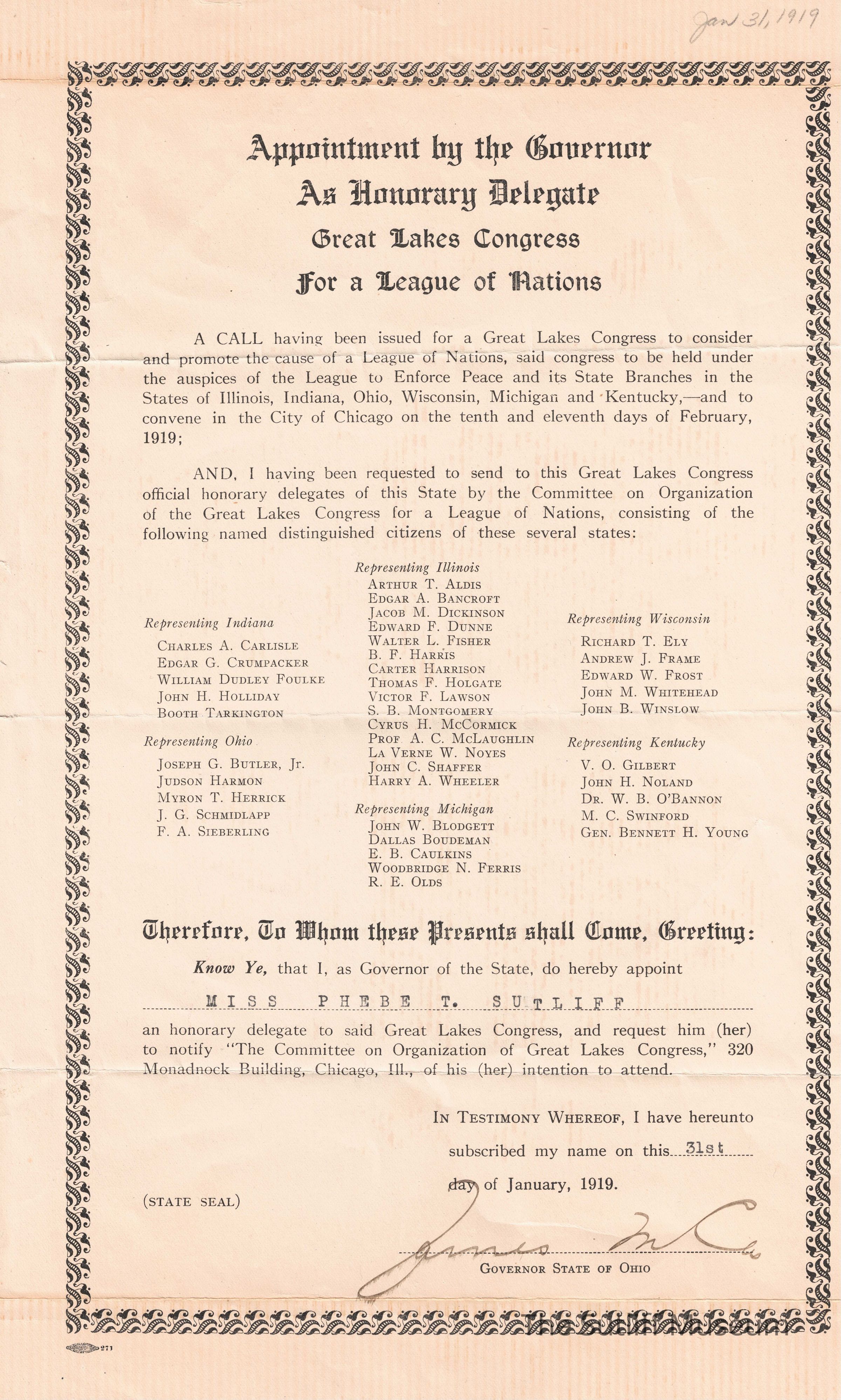 An Appointment by the Governor, James M. Cox, of Phebe Temperance Sutliff as an Honorary Delegate of the Great Lakes Congress for a League of Nations.Relationships