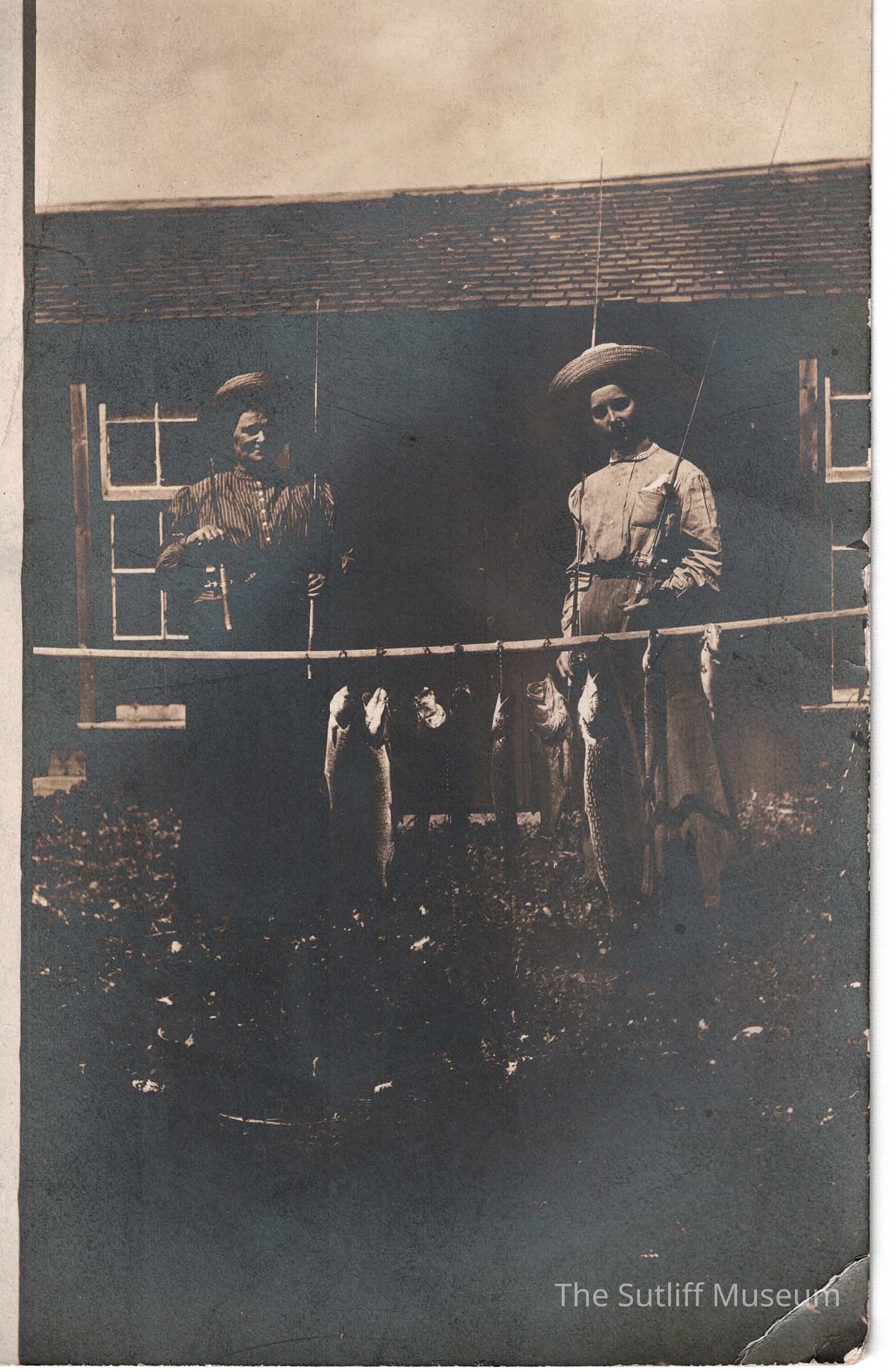 Postcard with black and white picture of two women holding fishing poles and standing behind a row of fish hanging. On back is written "Maude Gillmer" on top line, second line is "Amy Wilson-Campbell (Jo's mother) on left". Picture taken at Jack's Lake in Canada ca. 1912.Collection