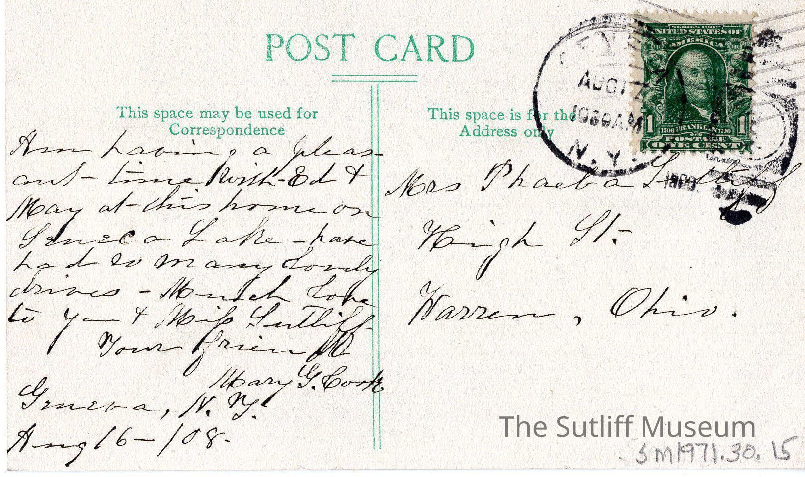 Postcard to Mrs Phebe Sutliff from Mary L. CookEntry/Object ID