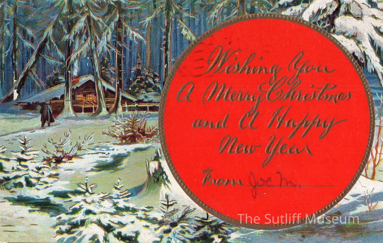 A postcard of a winter forest with the saying "Wishing you a Merry Christmas and a Happy New Year"Collection