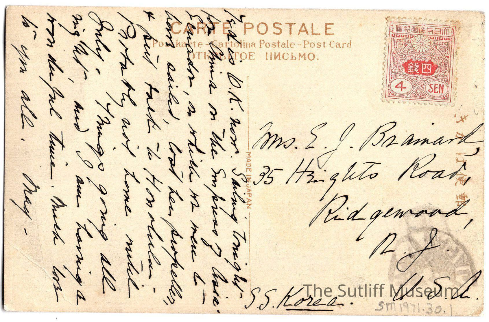 A postcard with color added of a cheery blossom hanging over a body of water and a bridge. The postcard is to Mrs. E.J. Brainard, Lydia Bostwick Sutliff Brainard, at 35 Heights Road, Ridgewood, N.J. from May, undated.Collection