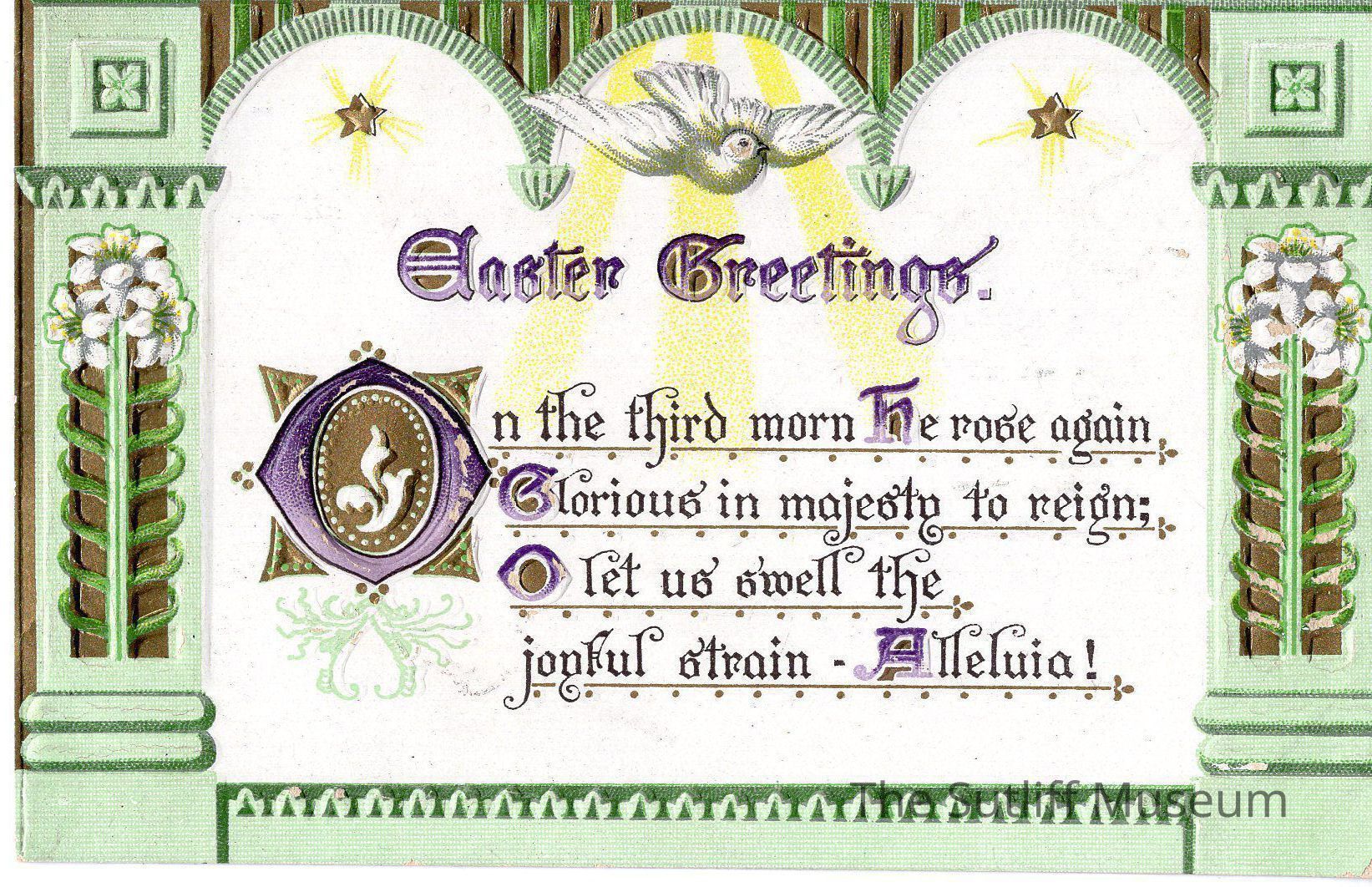 A postcard with the phrase "Easter Greetings. On the third morn he rose again. Glorious in majesty to reign. O let us swell the joyful strain Alleluia!"Collection