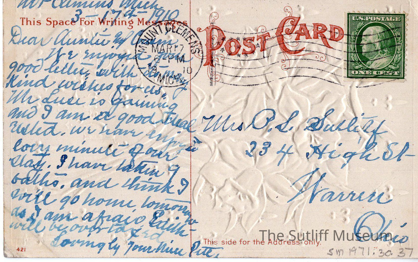 Postcard to P.L. Sutliff from niece Pat.Entry/Object ID