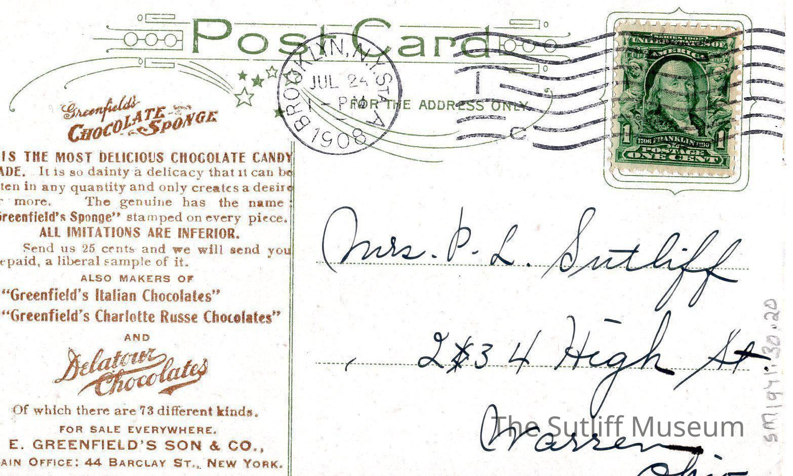 Postcard to Phebe L. Sutliff from Greenfield's Chocolate SpongeEntry/Object ID