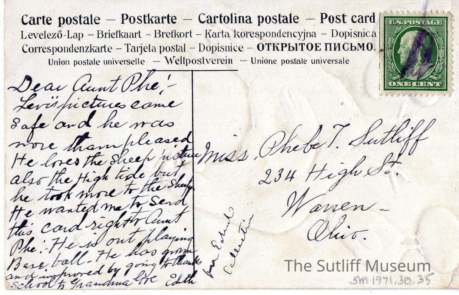 Postcard to Phebe T. Sutliff from Edith Granger SutliffEntry/Object ID