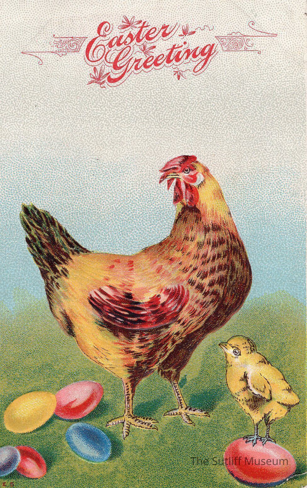 A postcard of a rooster and a chick with the phrase "Easter Greeting"Collection