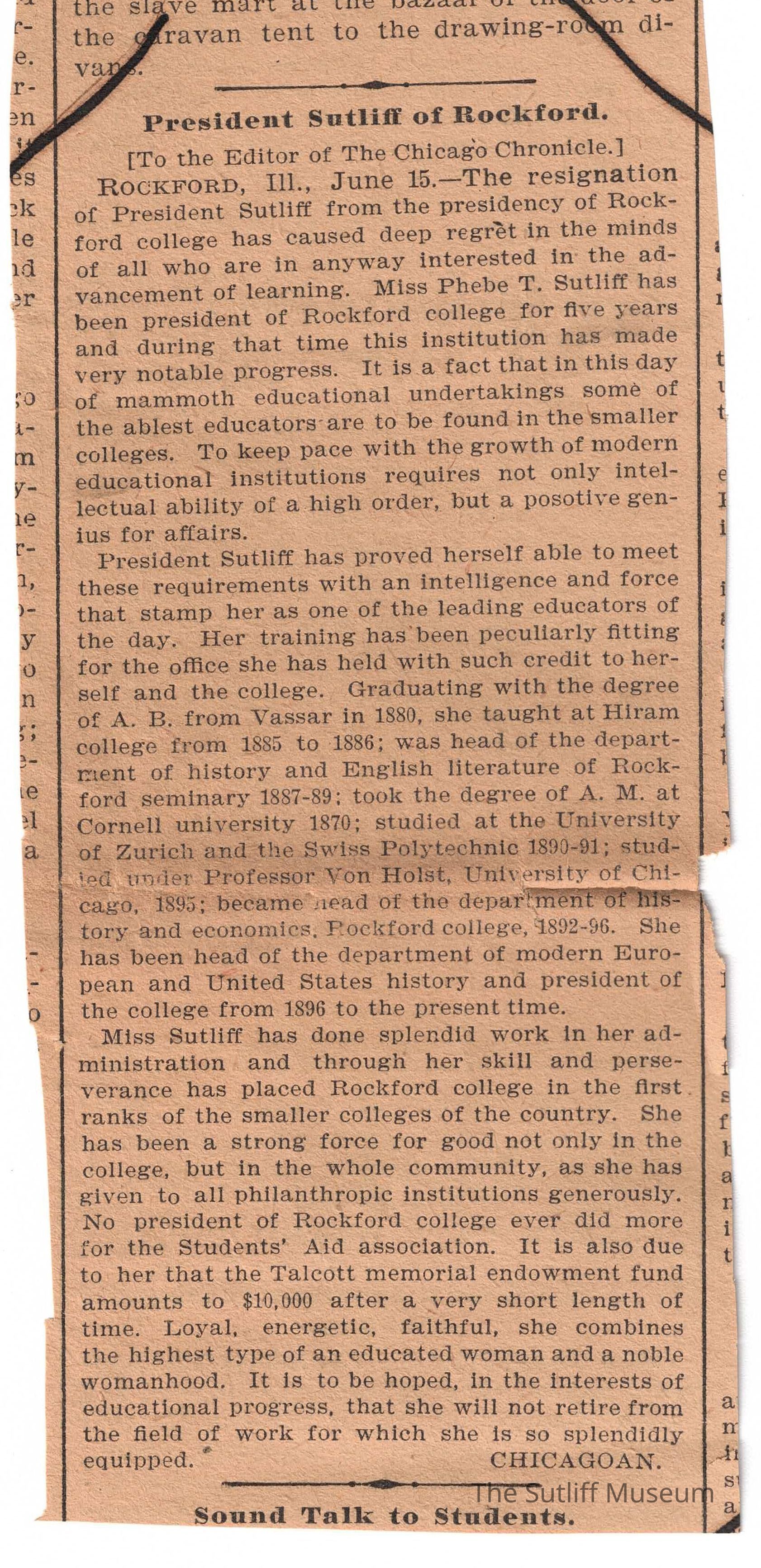 Newspaper clipping, "President Sutliff of Rockford" from a newspaper dated June 18, 1901.Archive Details