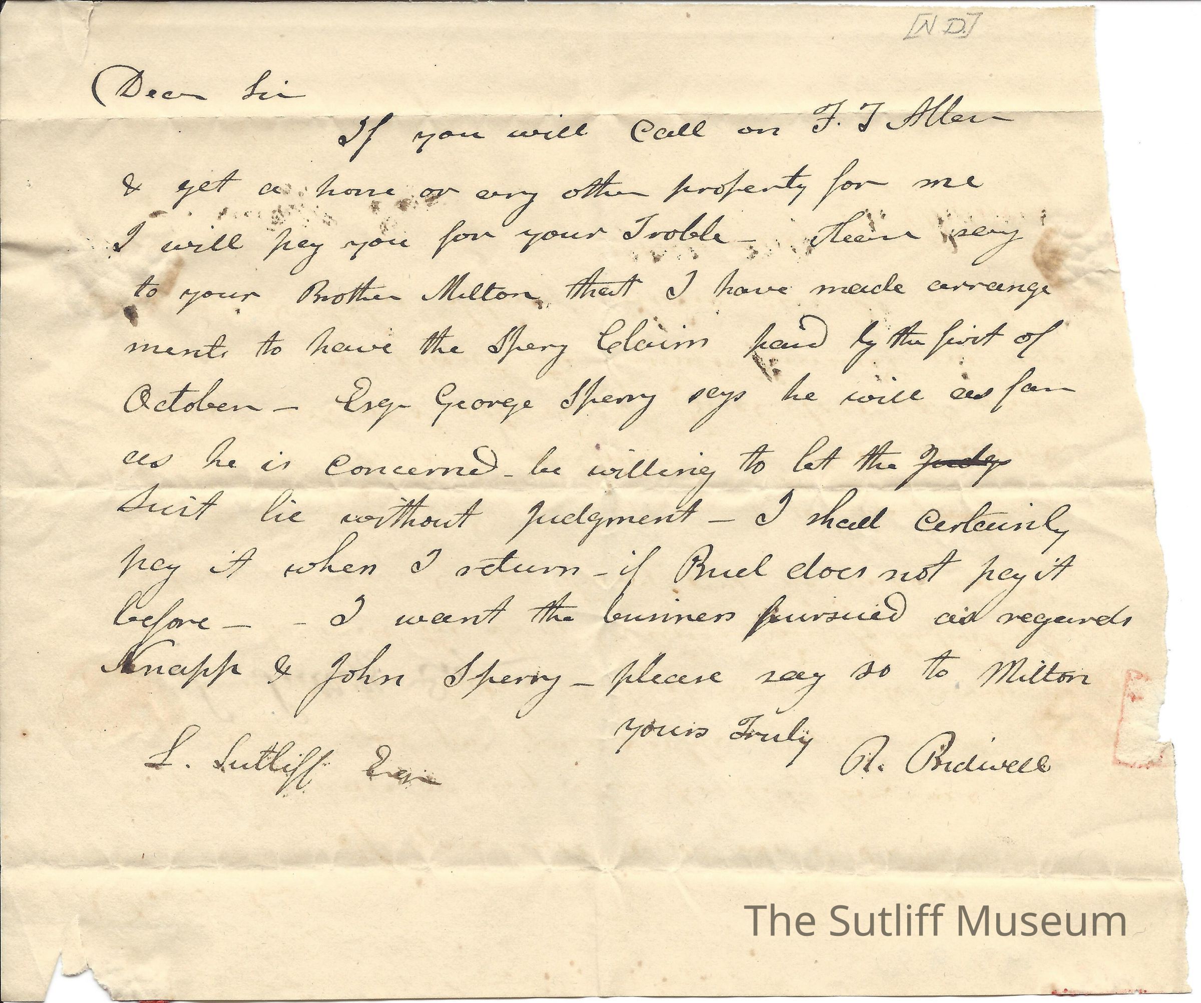 A letter from R. Bidwell to Levi Sutliff regarding acquiring a horse and getting in contact with Milton Sutliff.