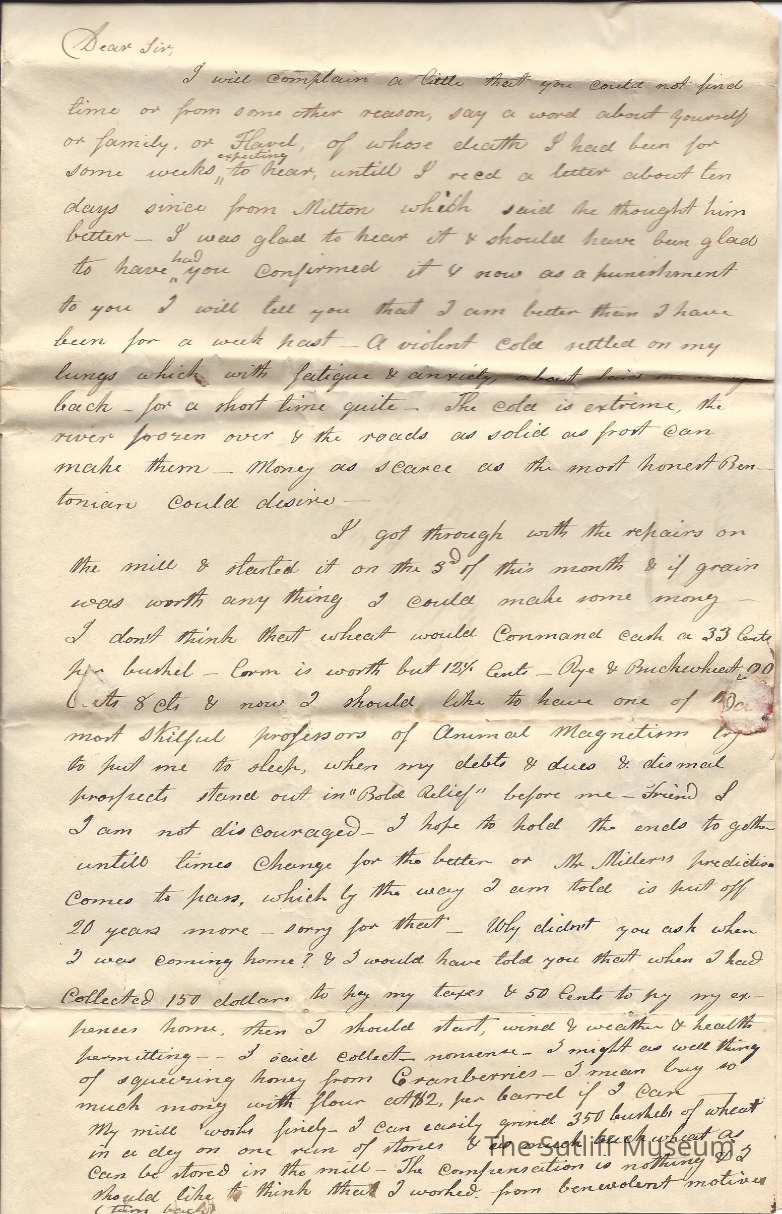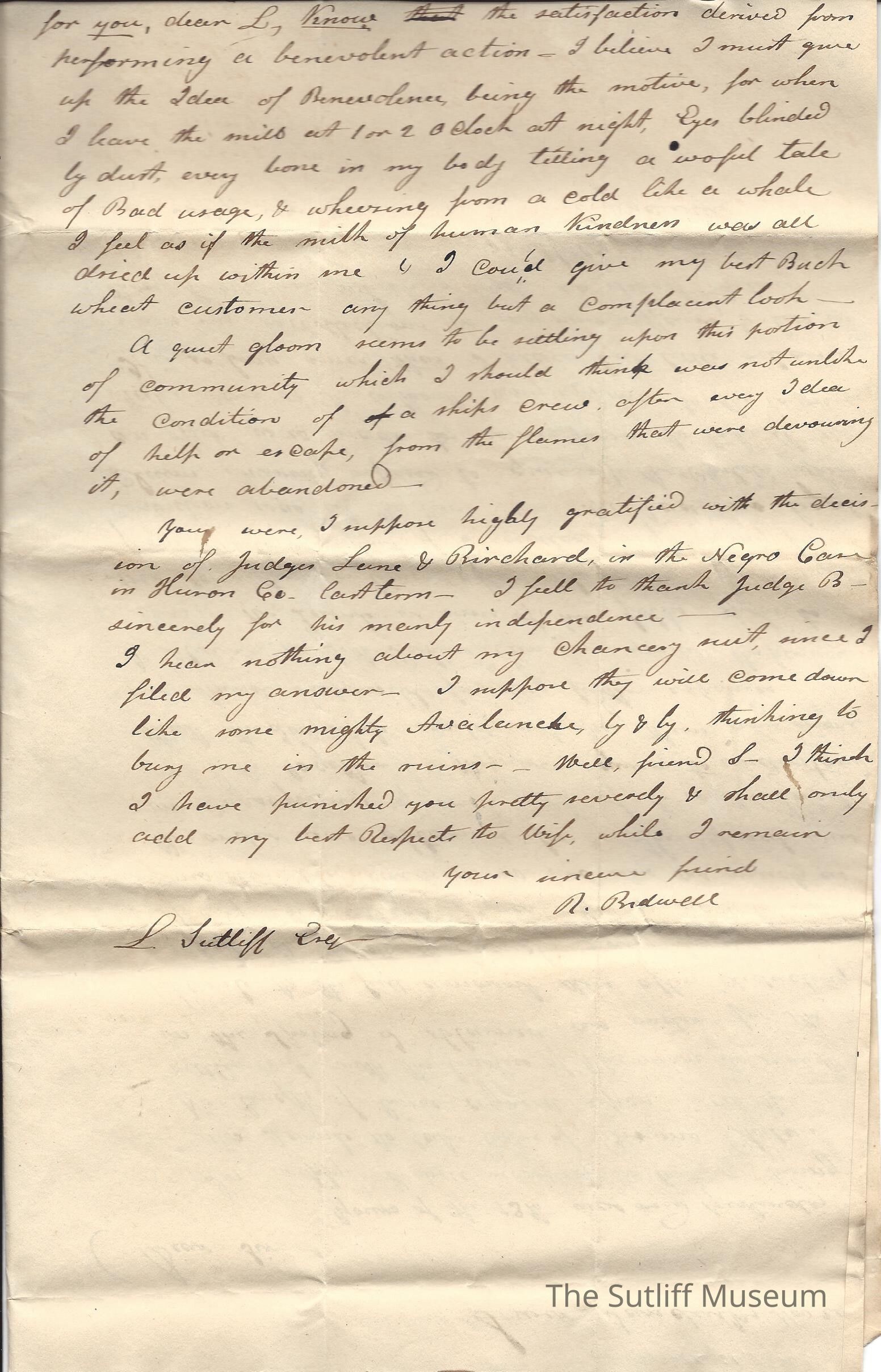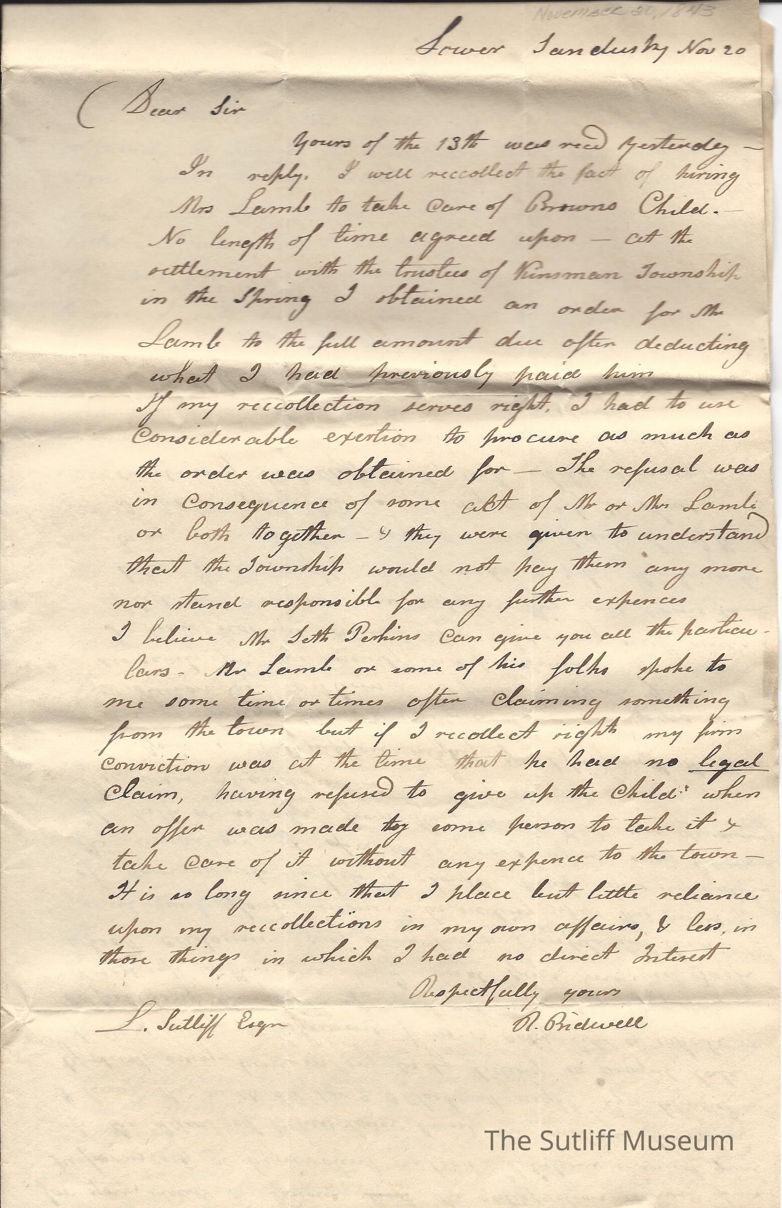 A letter from R. Bidwell to Levi Sutliff regarding the care of a child, legal claims, illness, updates about his mill and legal updates.Collection