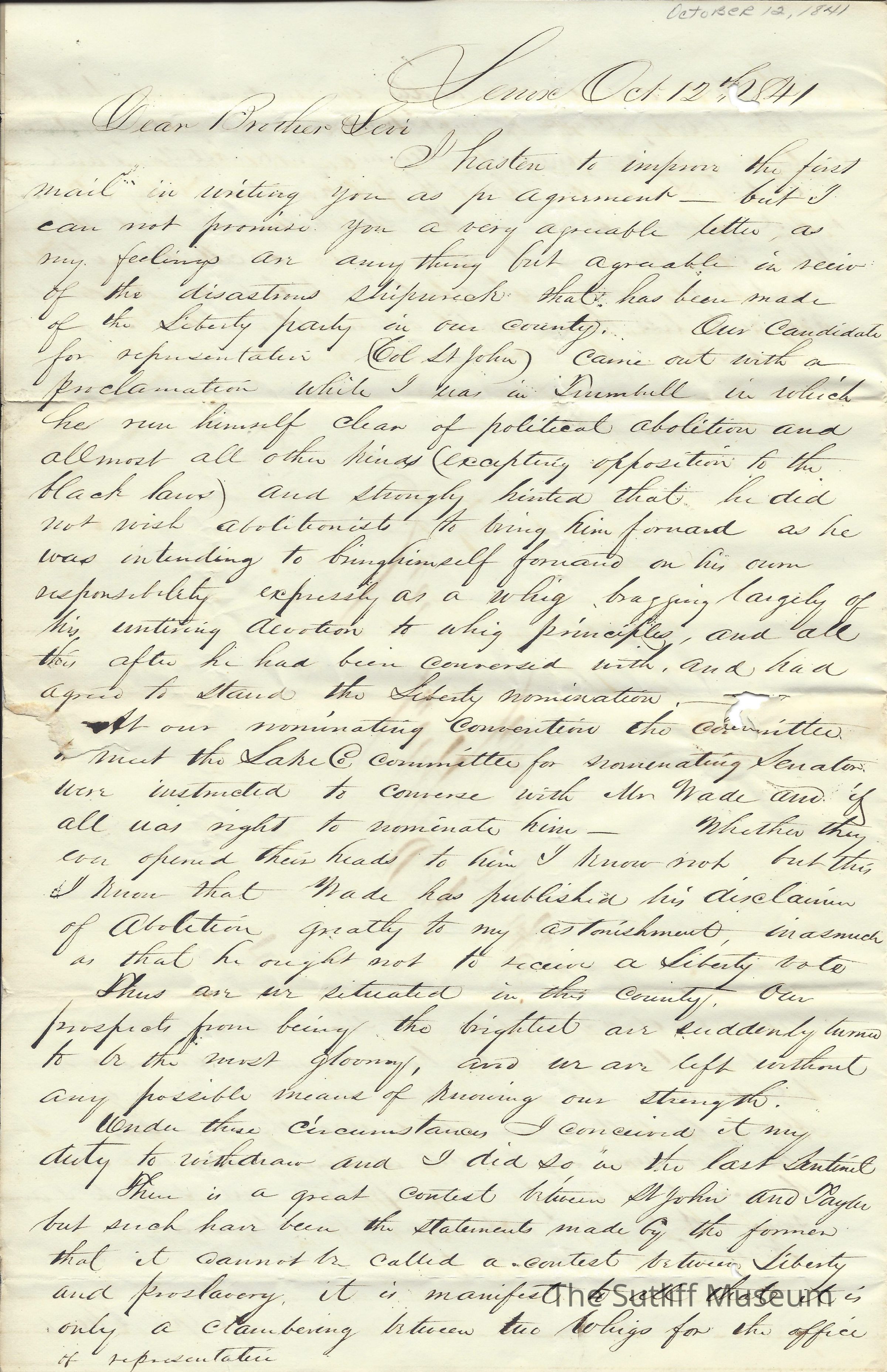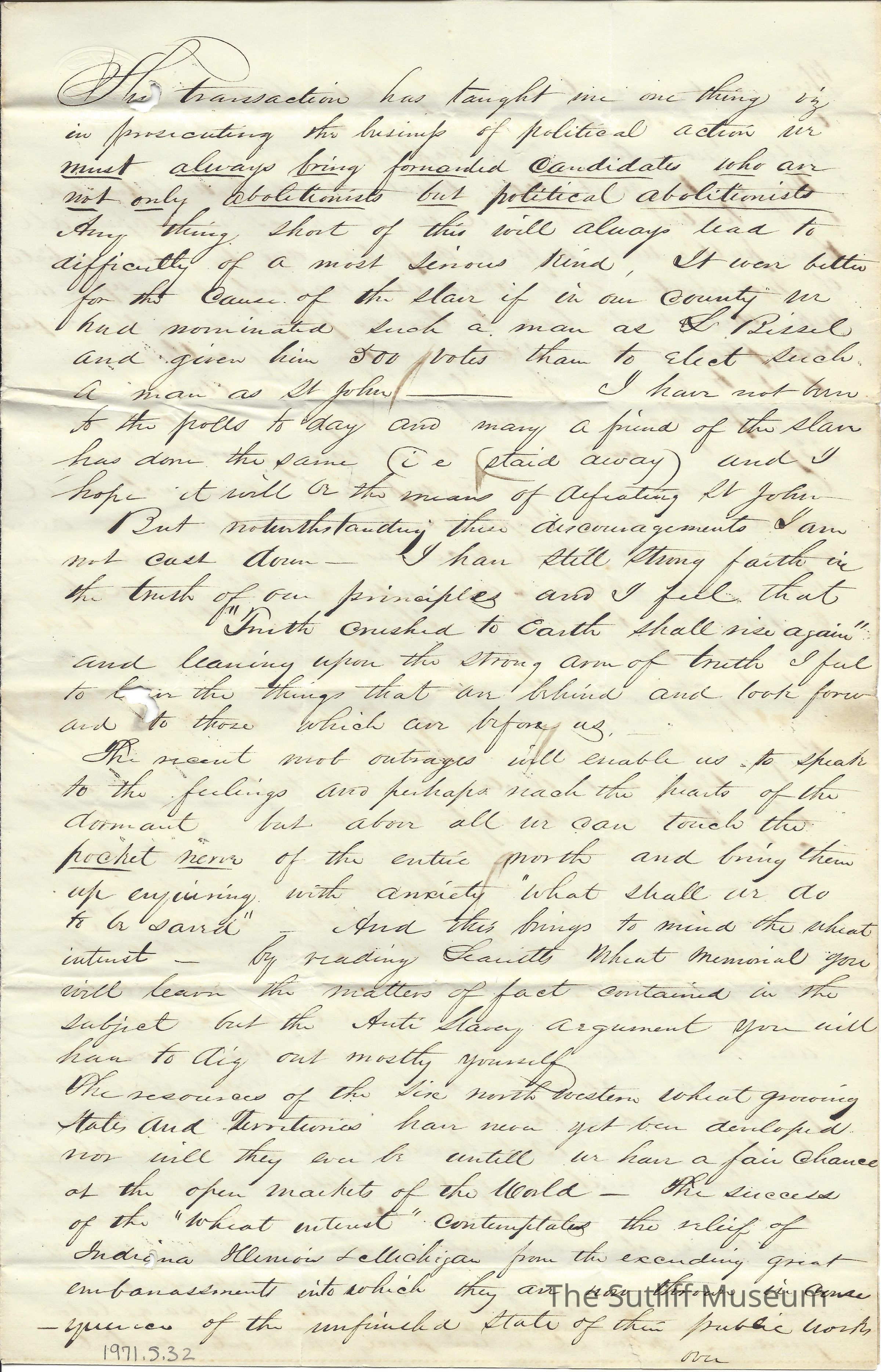 A letter from Ralph Plumb to Levi Sutliff regarding a potential abolitionist presidential candidate and other political concerns.Collection