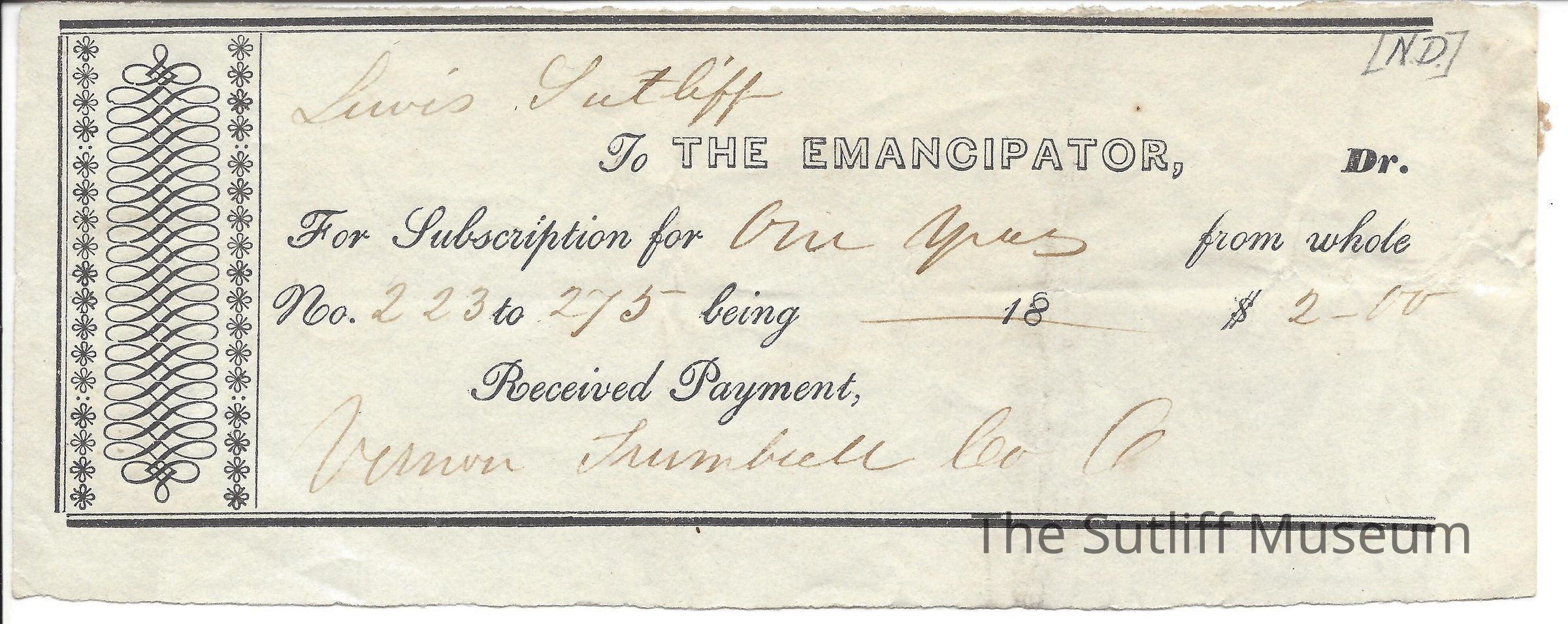 A receipt to Levi Sutliff for The Emancipator.Collection