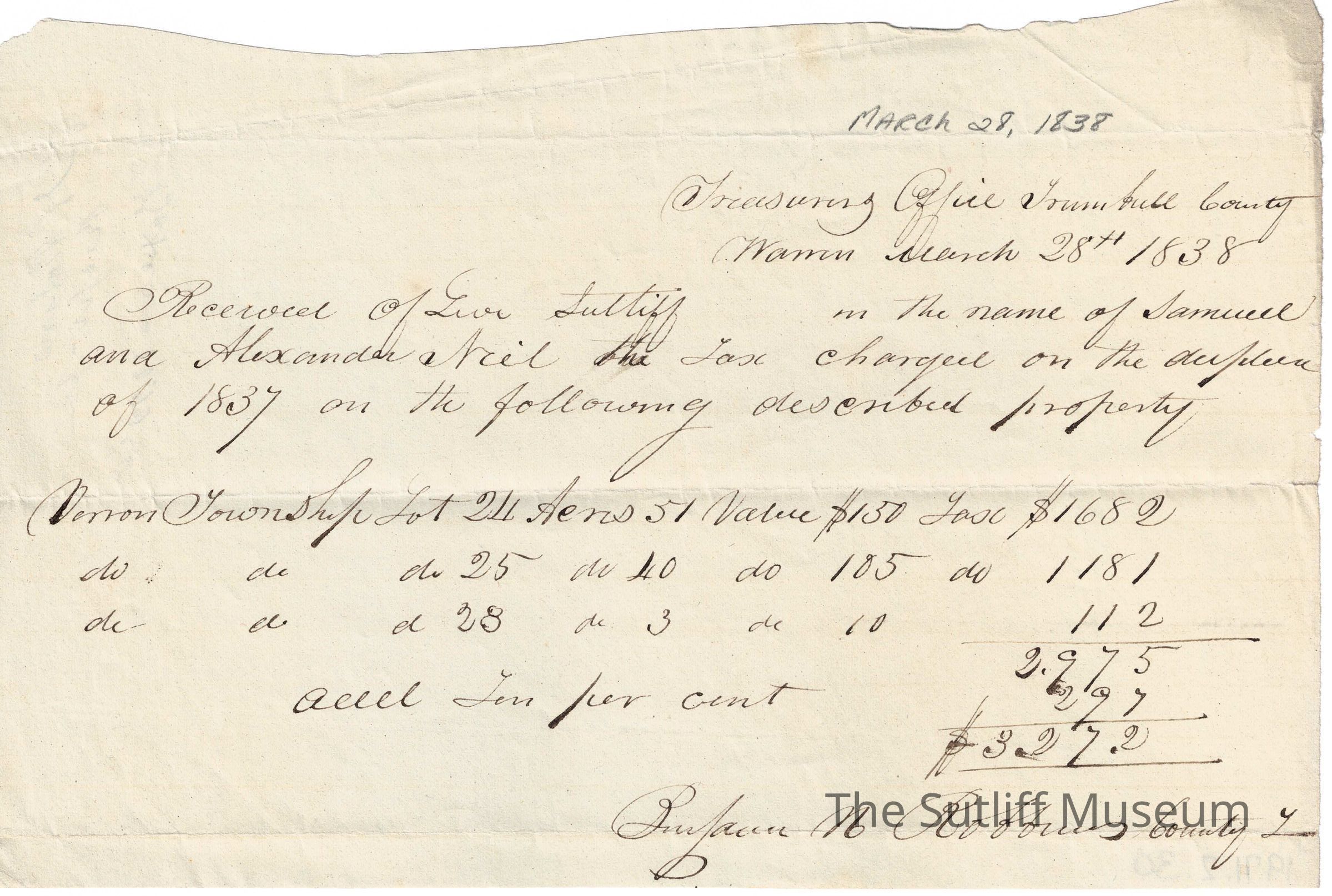 Receipt for taxes paid by Levi Sutliff in the name of Samuel and Alexander Niel for Lot 24 Acres 51 in Vernon, valued at $150 and taxes $1682Collection