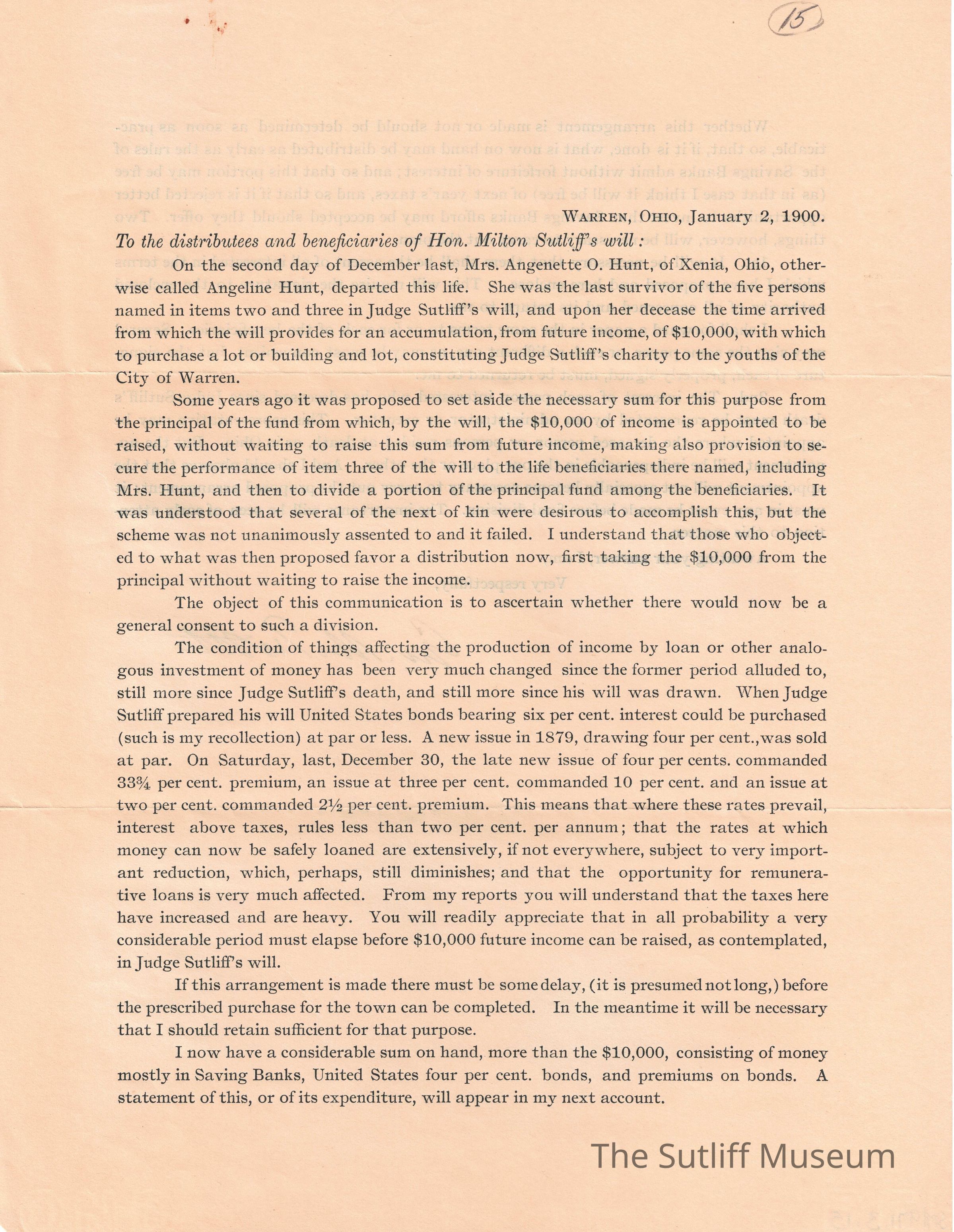 A letter regarding Milton Sutliff's will and how it will be distributed since one of the beneficiaries has passed. It includes the conditions of the arrangement.Collection