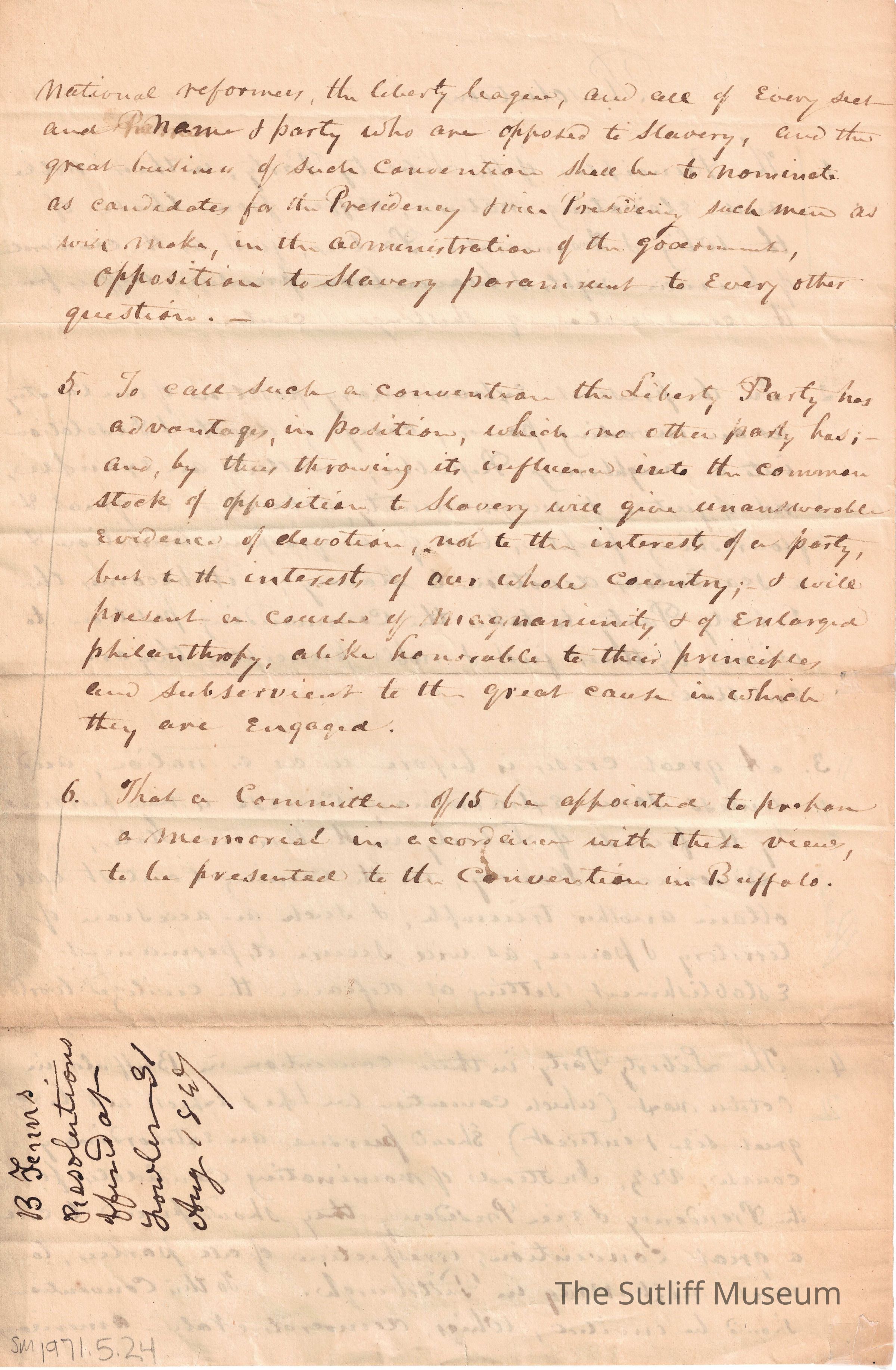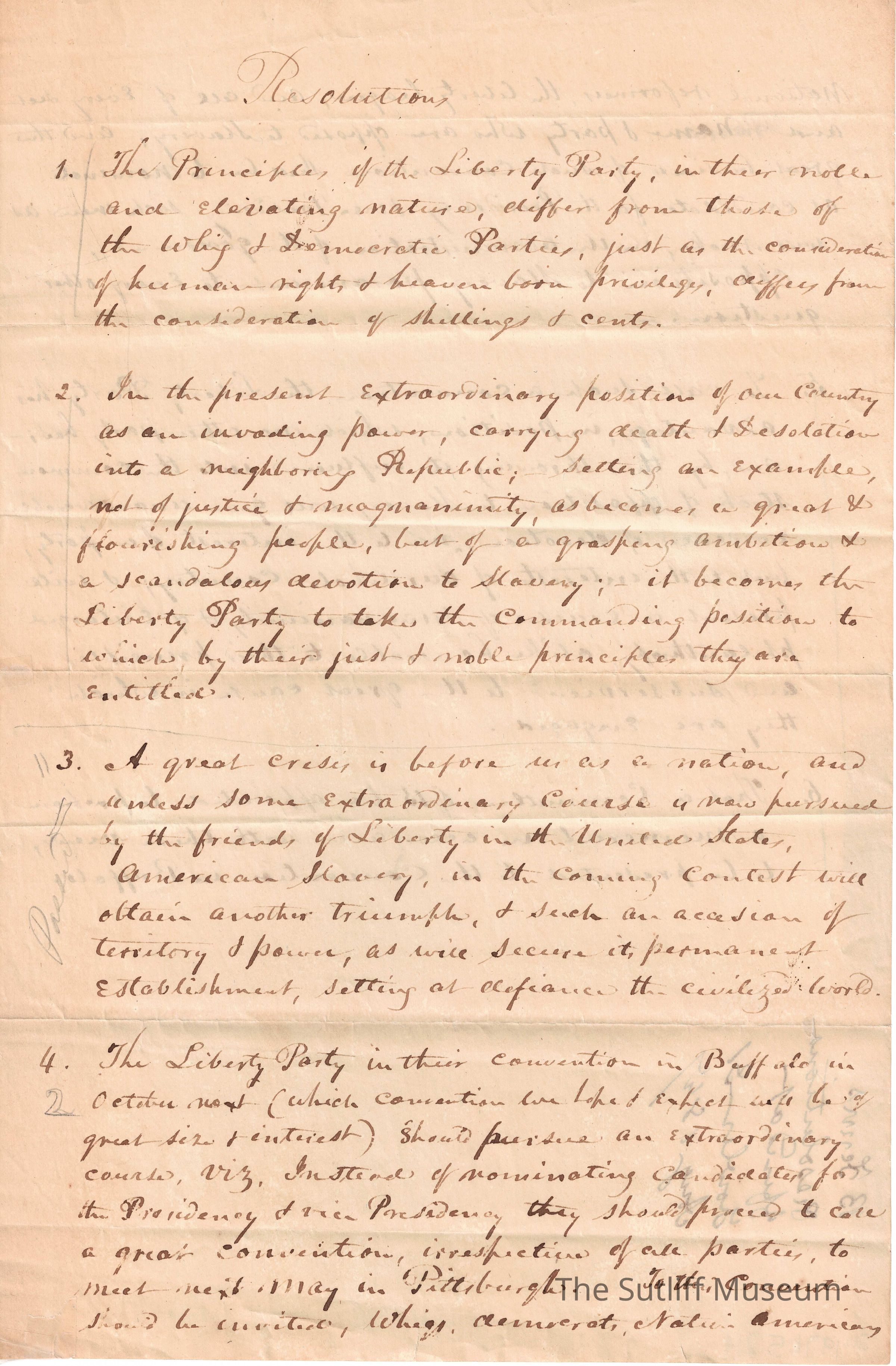 A document regarding resolutions for an anti-slavery society.