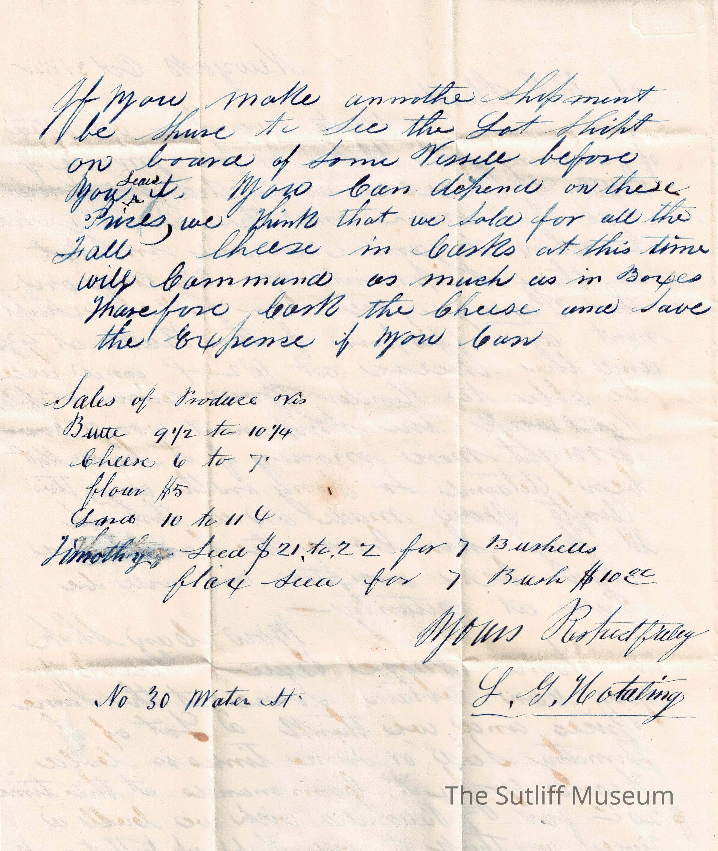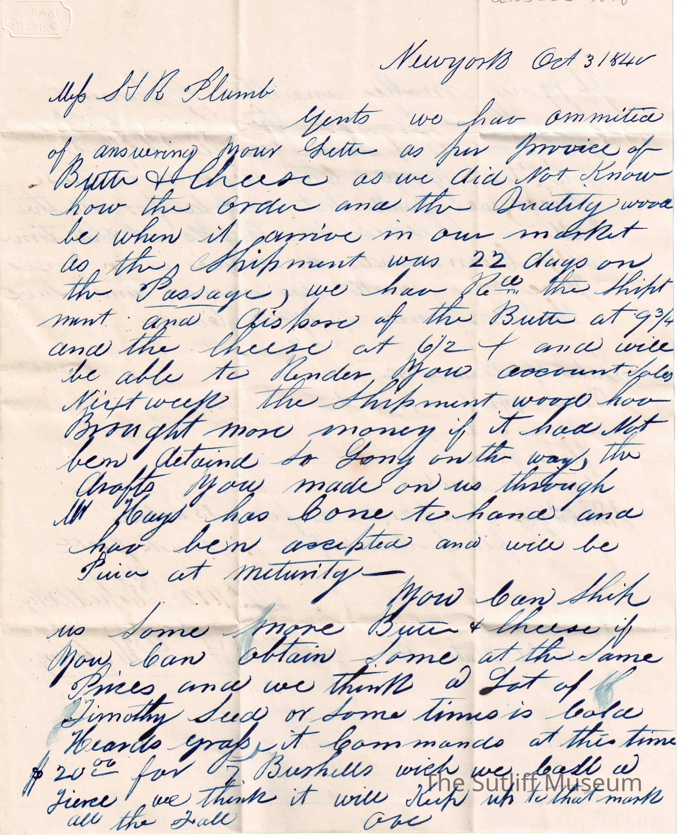A letter from Leonard G. Hotating to Samuel and Ralph Plumb regarding a request for an order of butter and cheese.Collection