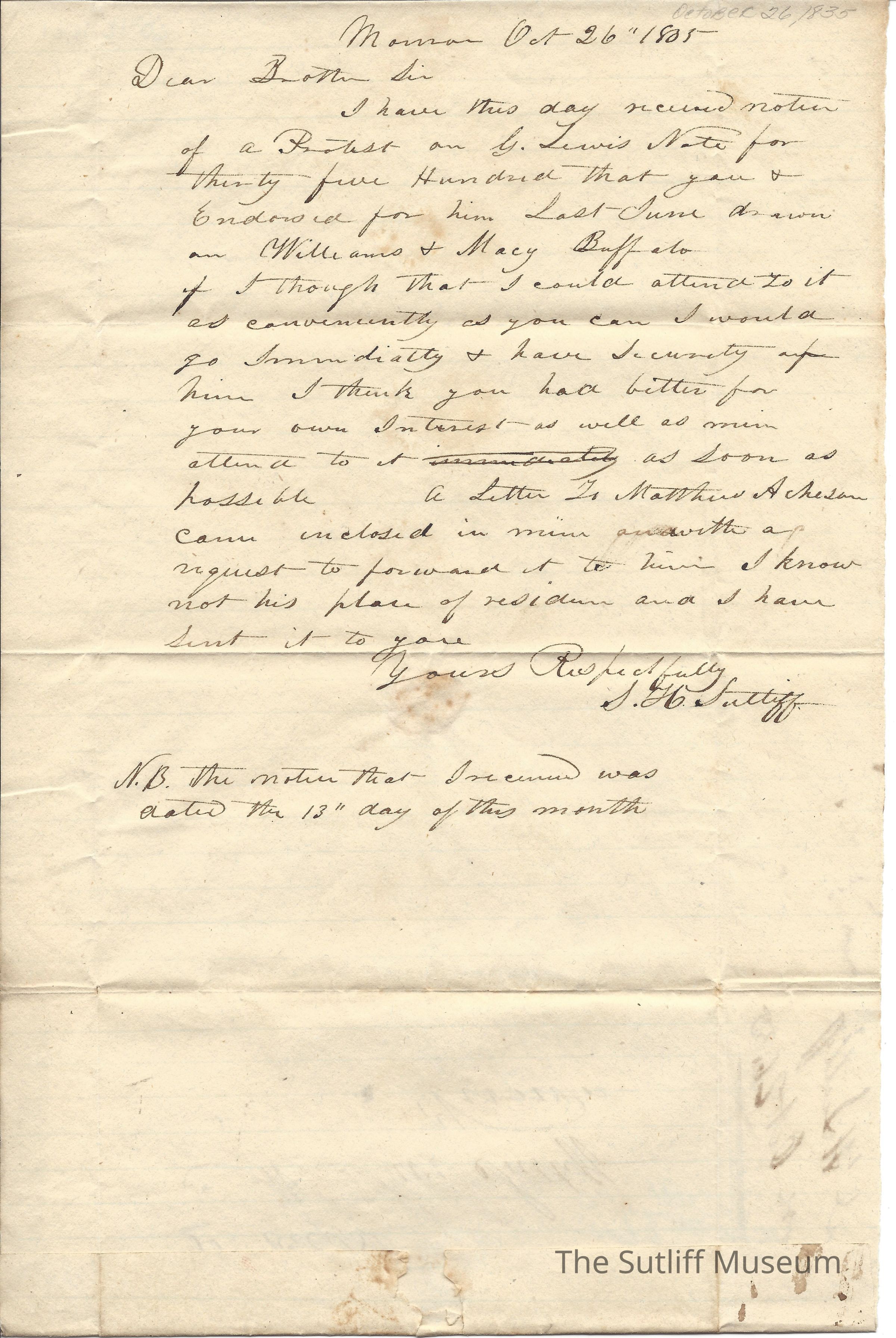 A letter from Samuel Harvey Sutliff to Levi Sutliff informing him of a note of payment he thinks will be of interest and a letter he had forwarded.Collection