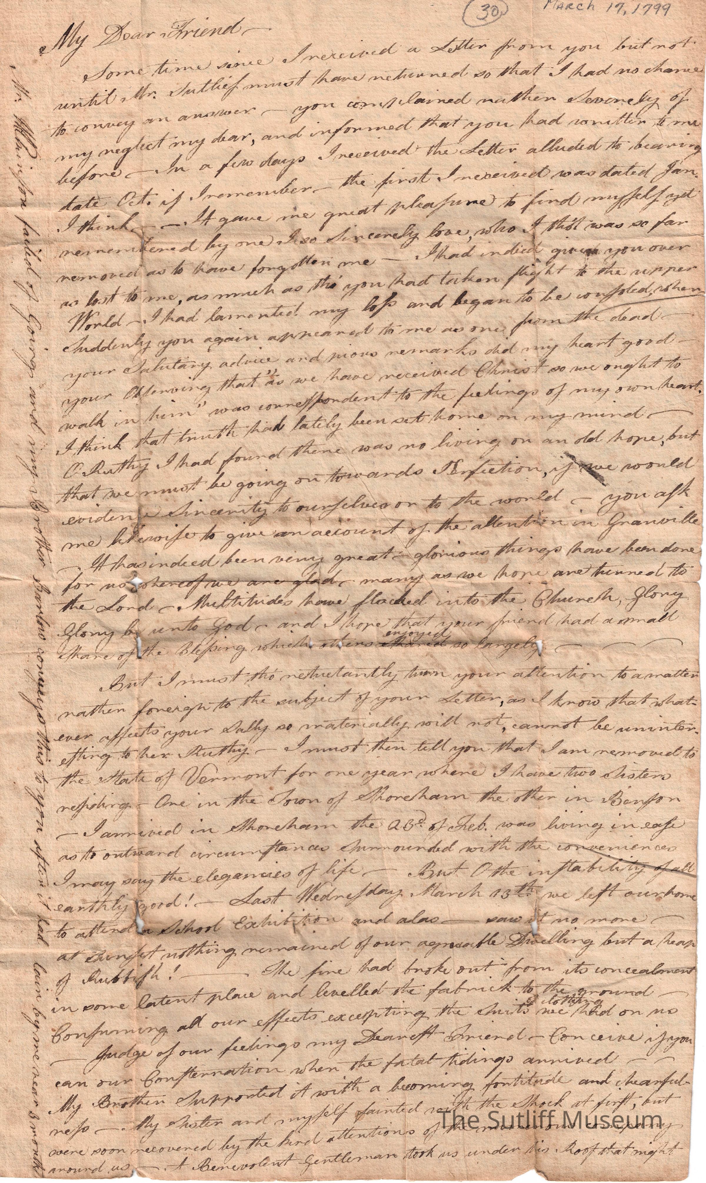 A letter from Sally Prat to her sister Ruth Sutliff with updates, her opinions, and news of a fire.Collection
