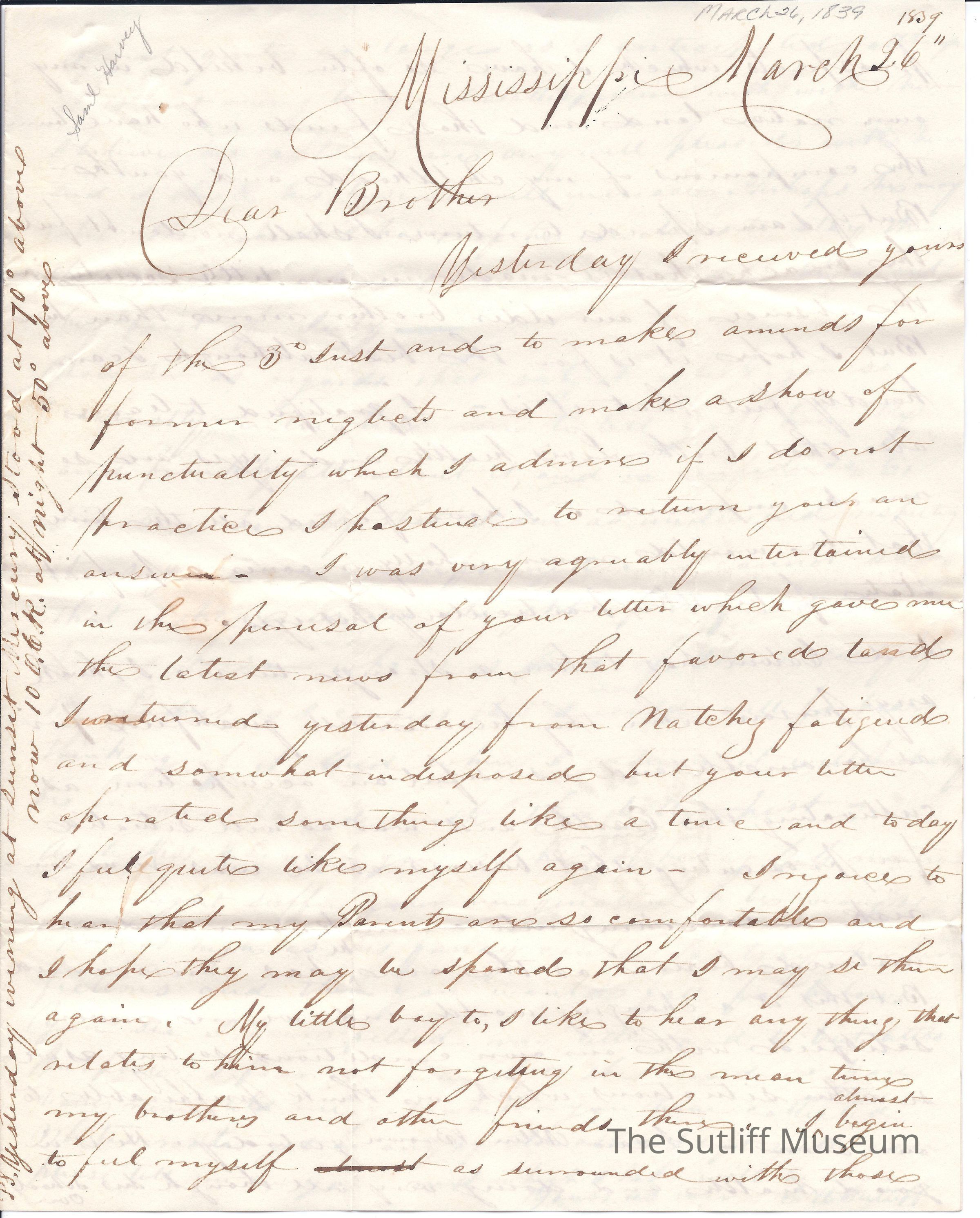 Letter from Samuel Harvey Sutliff to Flavel Sutliff from Mississippi to thank Flavel for a previous letter. Samuel expresses gratitude that Levi's eyes are improving, dismay that Calvin is leaving farming and an update on Allen Brown's school. Also mentions a Mrs. L.