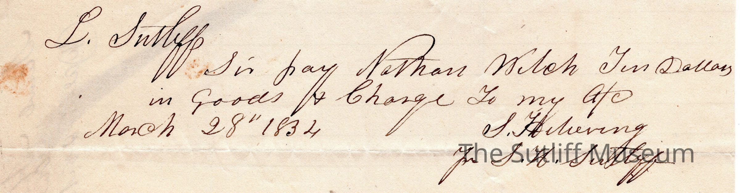 A note from Samuel Helvering and Samuel Harvey Sutliff to Levi Sutliff regarding a payment.Relationships