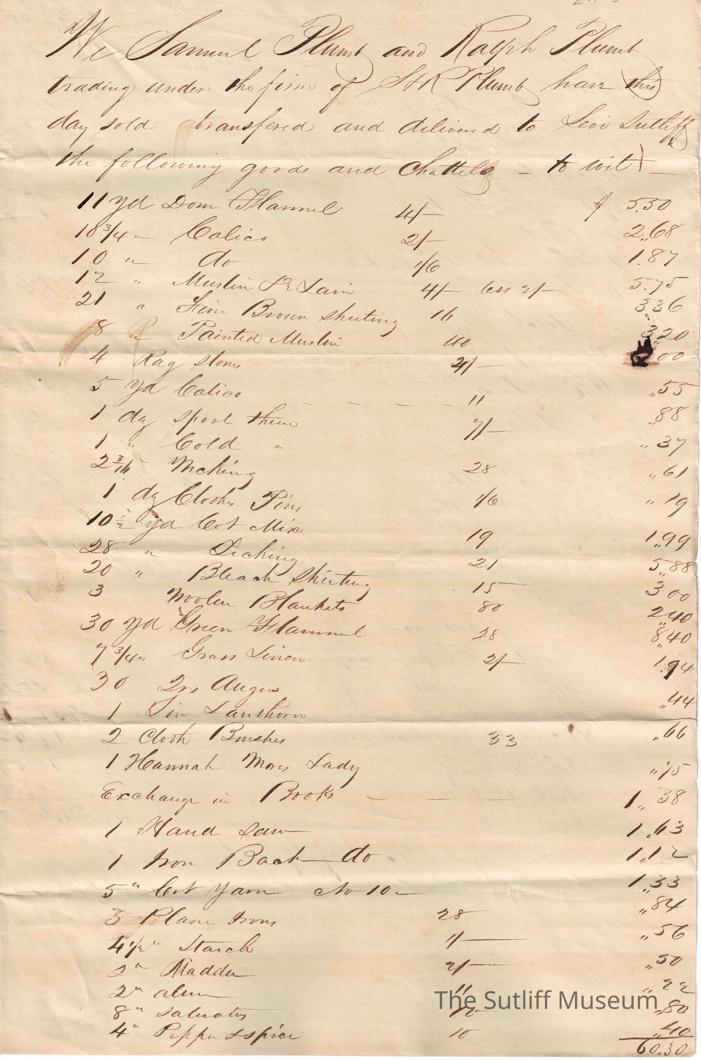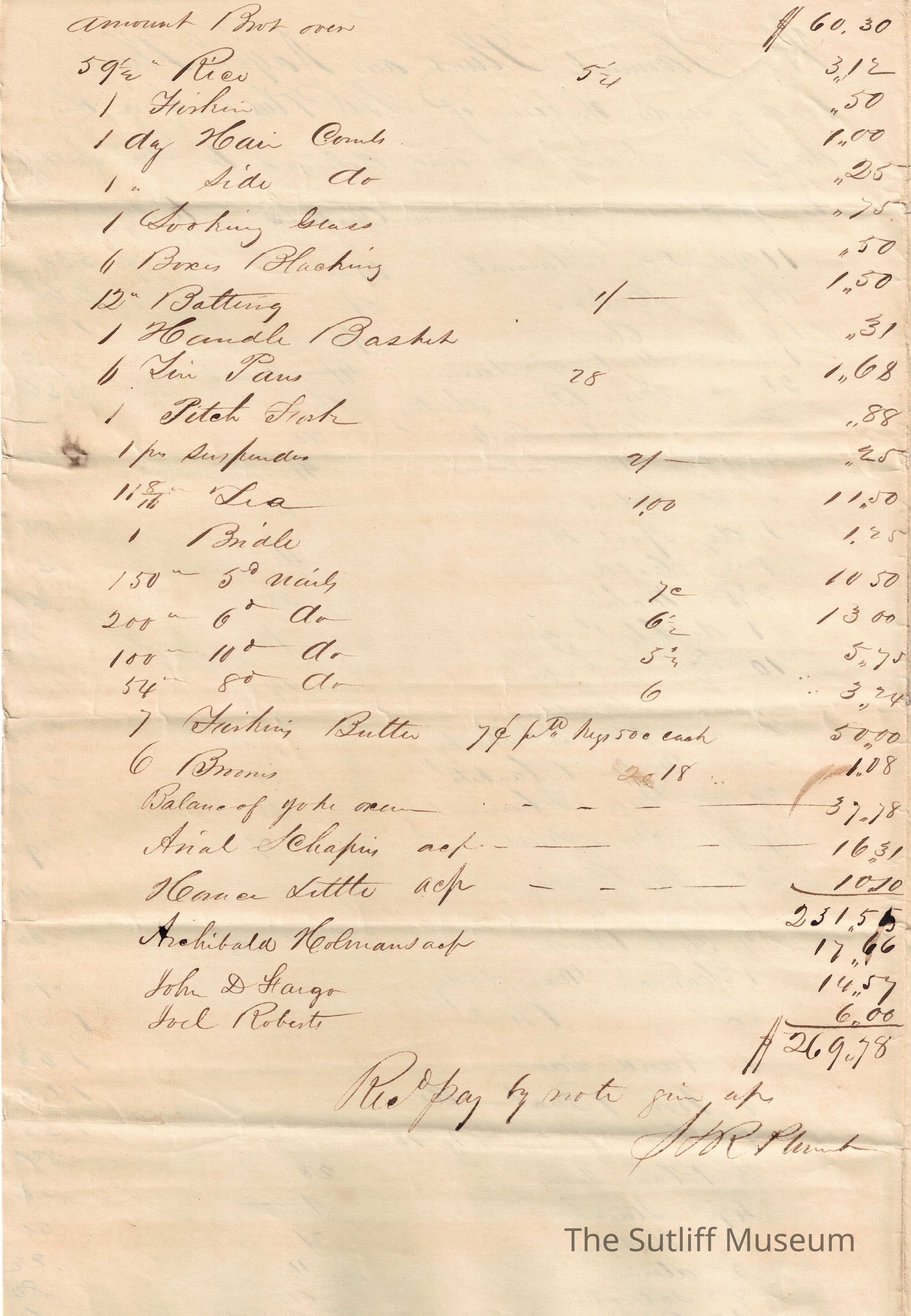 Bridles, Grocers, Saws, Calico, Brooms & brushes, Pitchforks, Looking glasses, Clothespins, Blankets, Baskets, Butter, Hair ornaments, Nails & spikes, Spices, Rice, Thread, Tea, Shirts, Cloth, Grocery listsSearch Terms