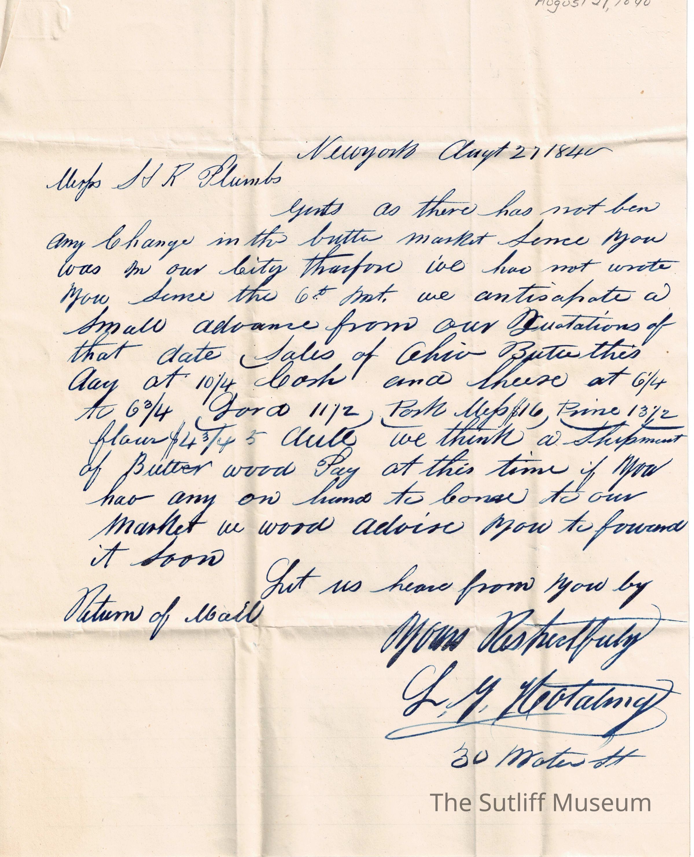 A letter from Leonard G Hotating to Samuel Plumb updating him on the current market and business advice.Collection