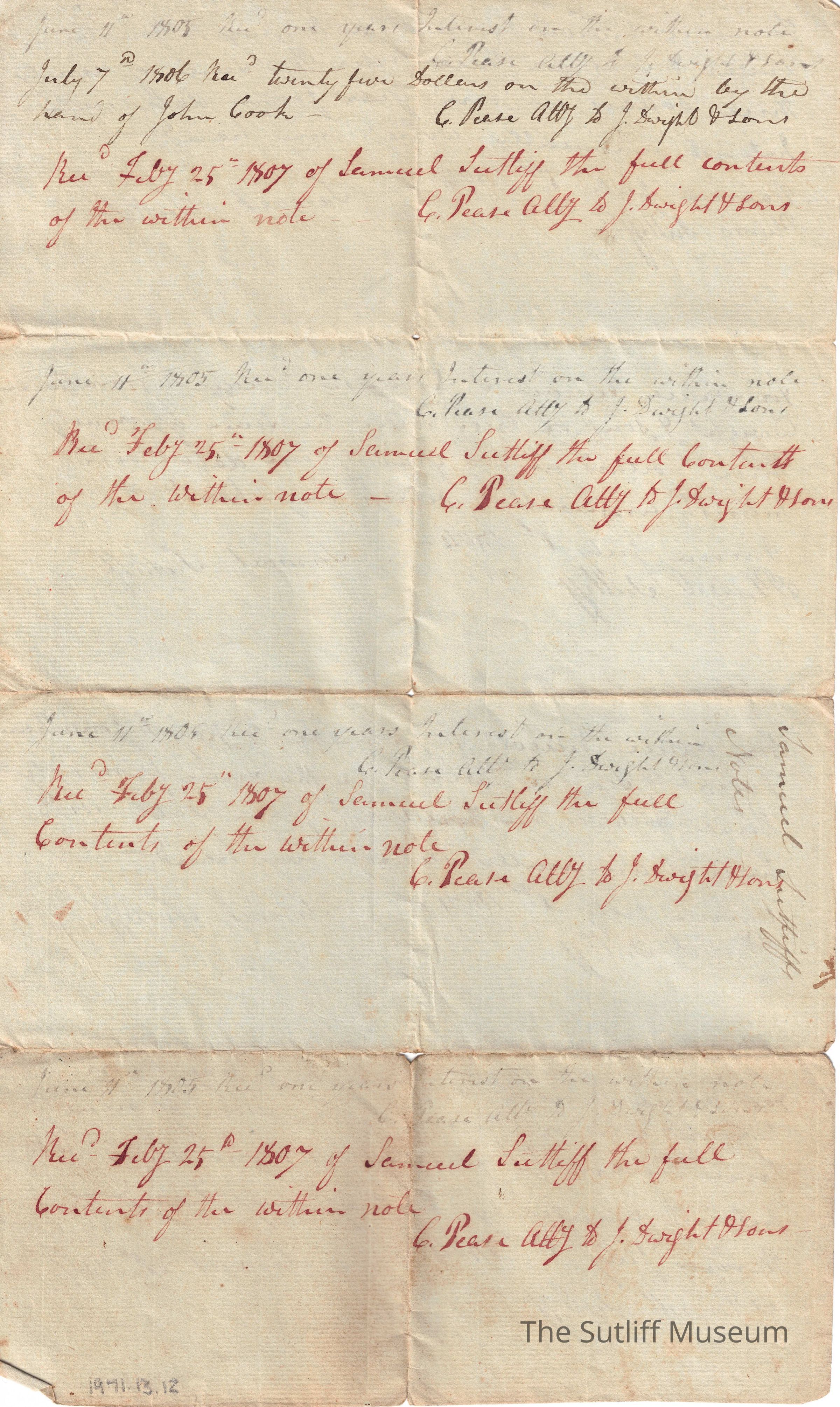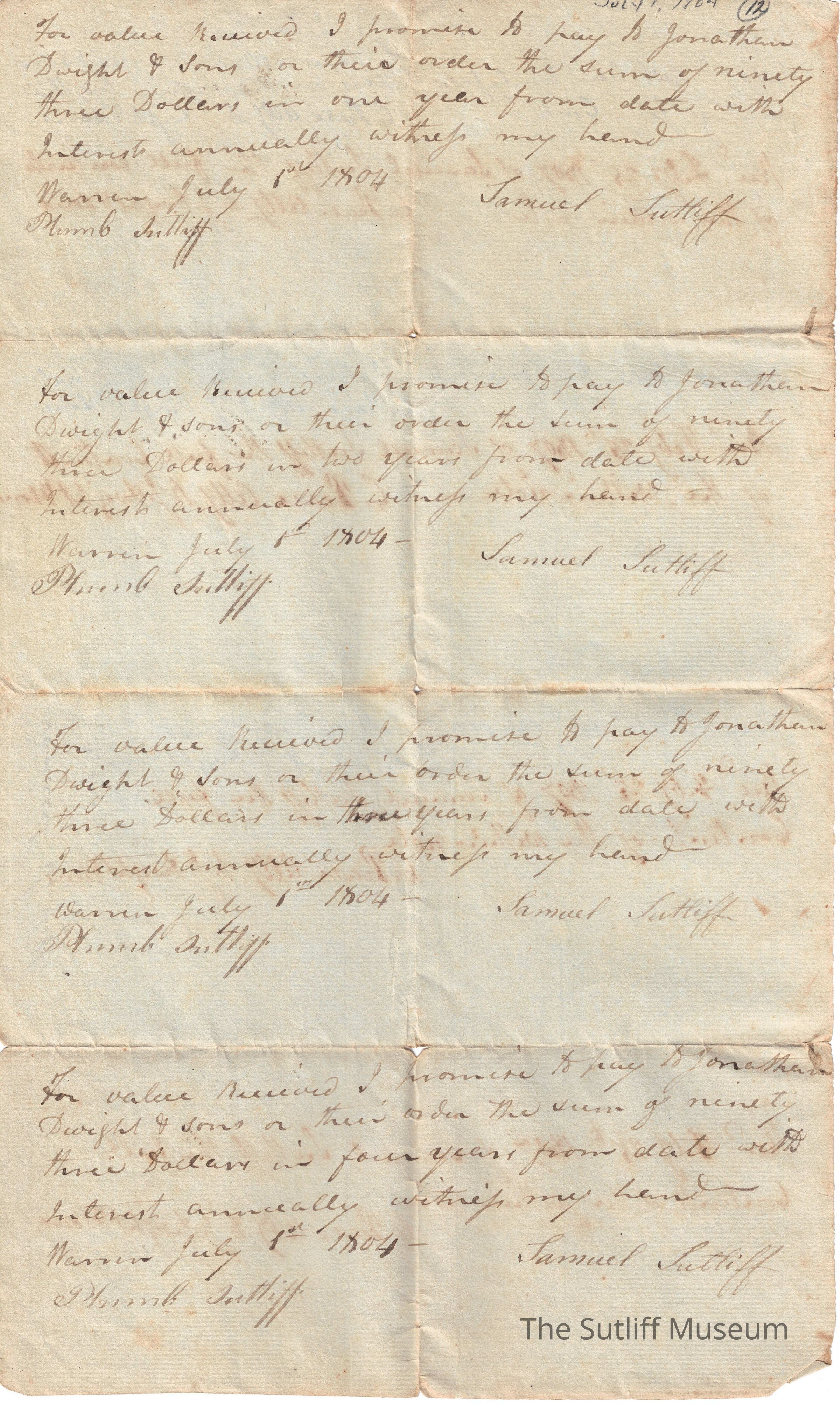 Various small notes from Samuel Sutliff to Jonathan Dwight & Sons for their land, as well as notes from J.Dwight & Sons receiving the payment.Collection