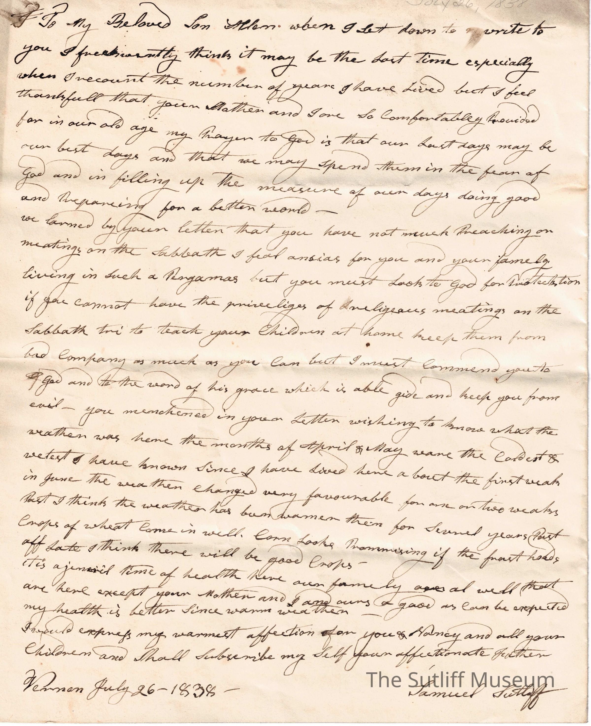 1830s, Correspondence Between Sutliffs, Family, Illness, ReligionDescription