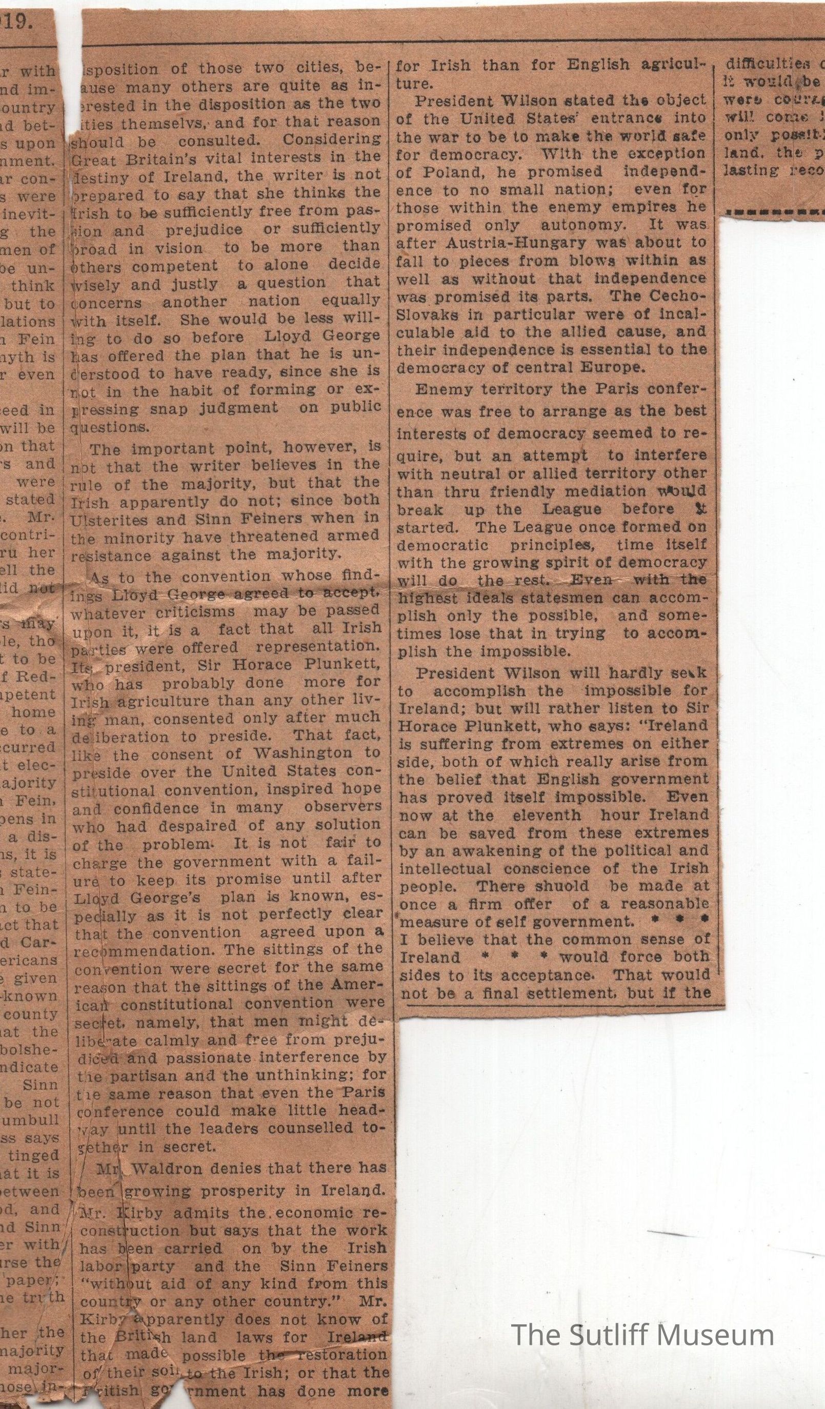 An article titled "Sinn Fein and The League" Miss Sutliff's reply to E.A. Kirby and J. Waldron. Dated 5/14/1919Collection