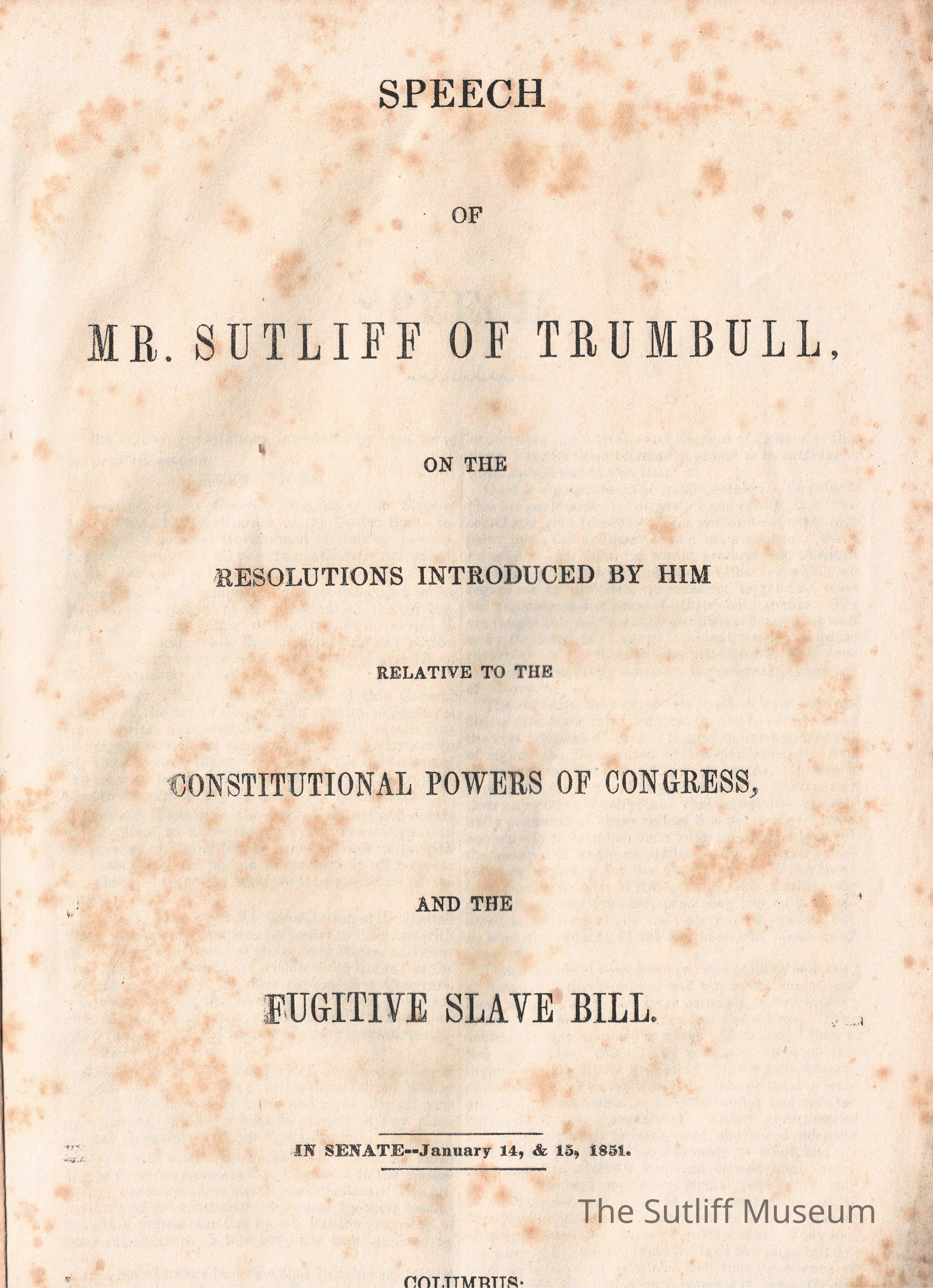 Speech of Mr. Sutliff of Trumbull on the Resolutions Introduced by Him Relative to the Constitutional Powers of Congress and the Fugitive Slave Bill in Senate- January 14 & 15, 1851. Speech by Milton Sutliff.