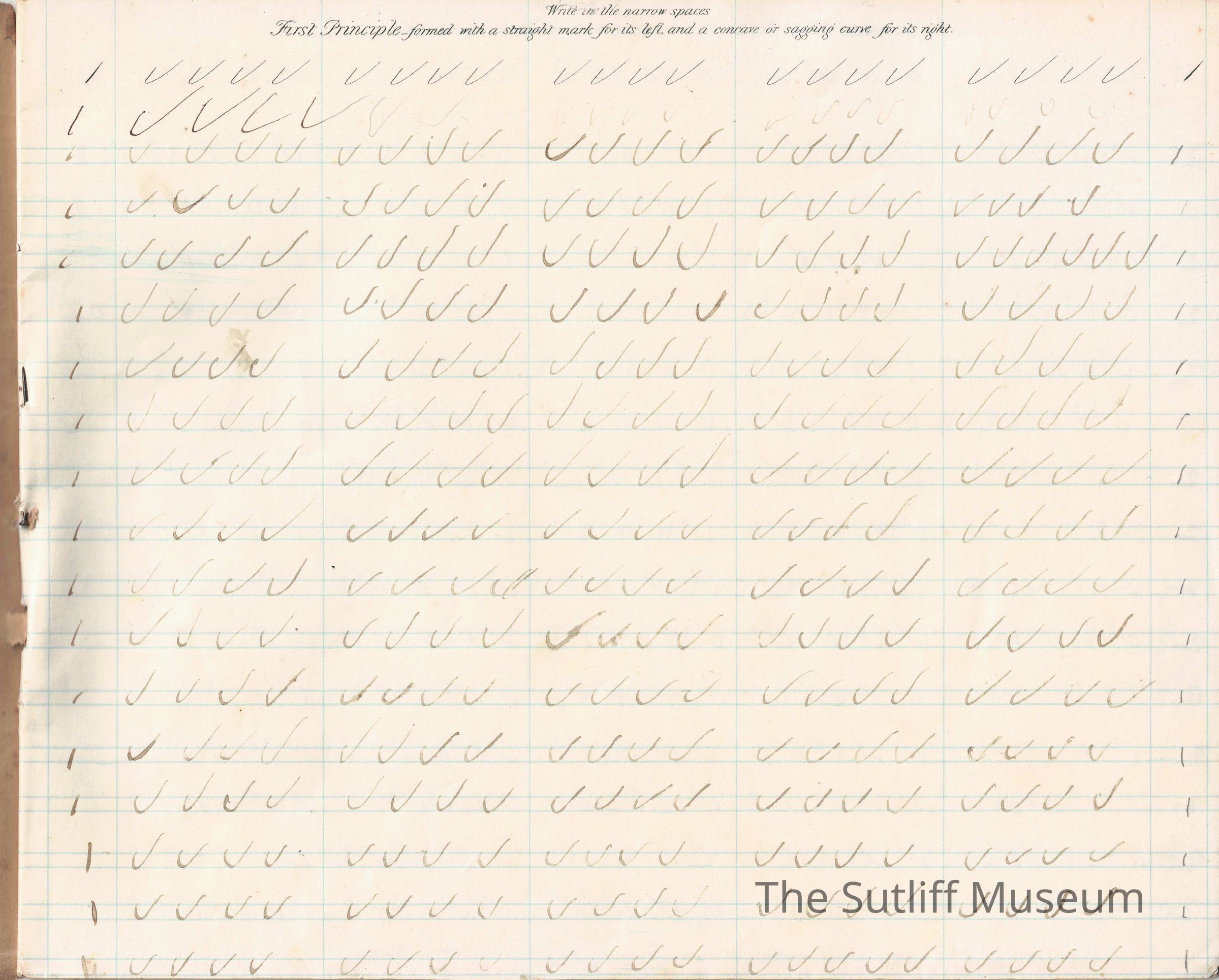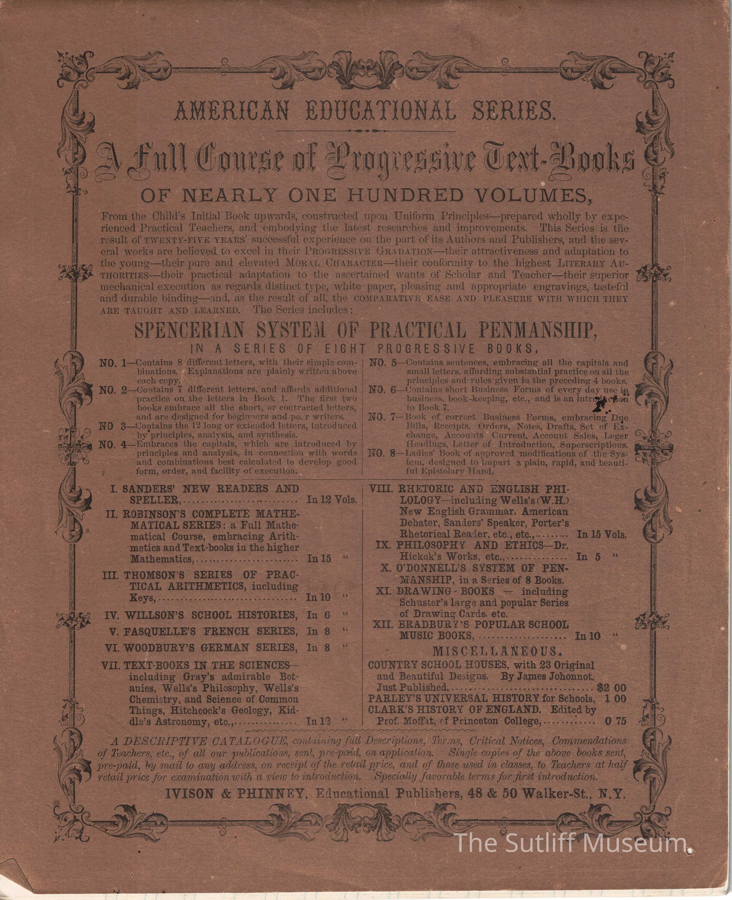 Spencerian System Practical Penmanship book. Off white soft cover with decorative black border and black text. On front cover is rectangular box with space for students to place name. Mary R. Sutliff has been handwriten in box very faintly.