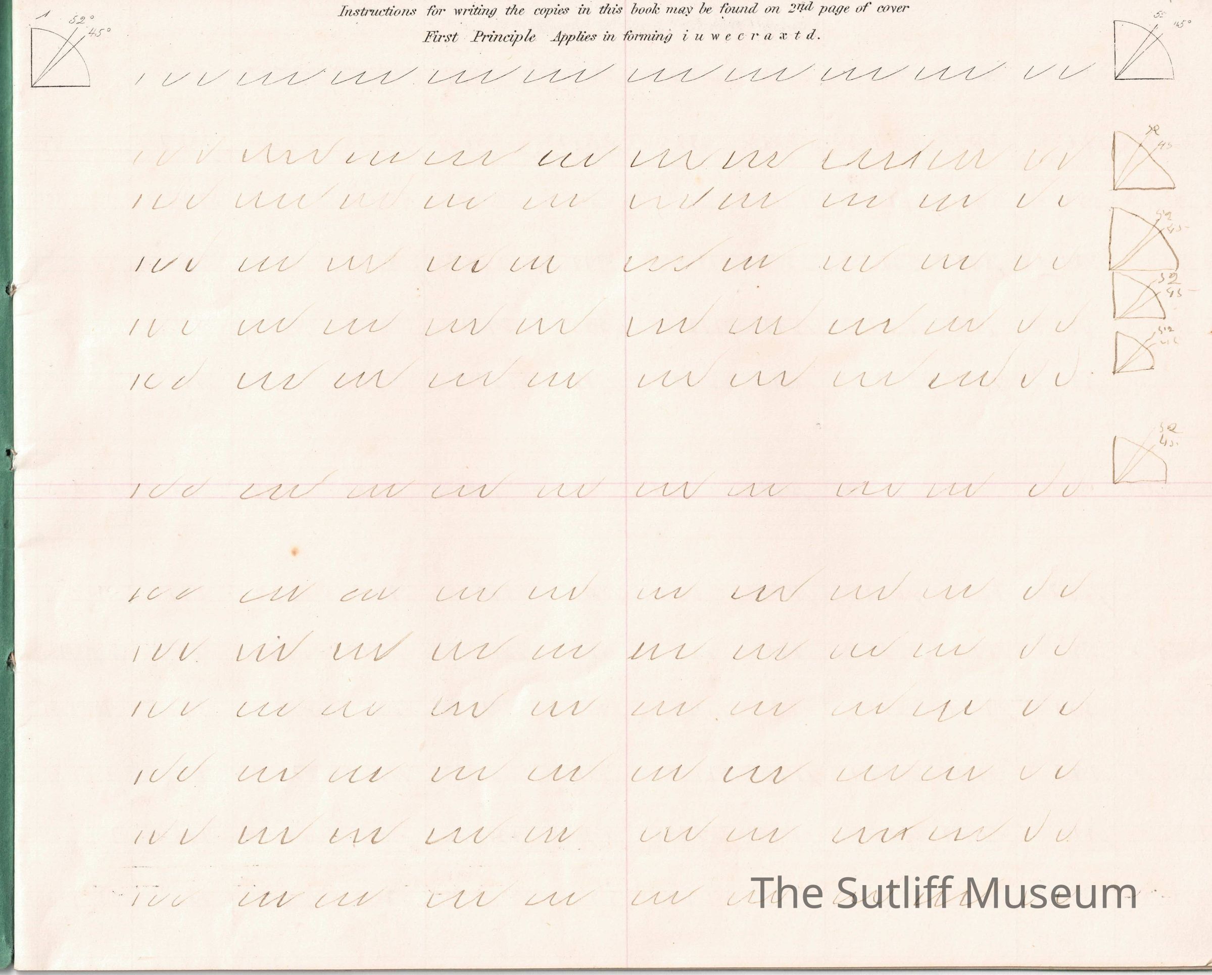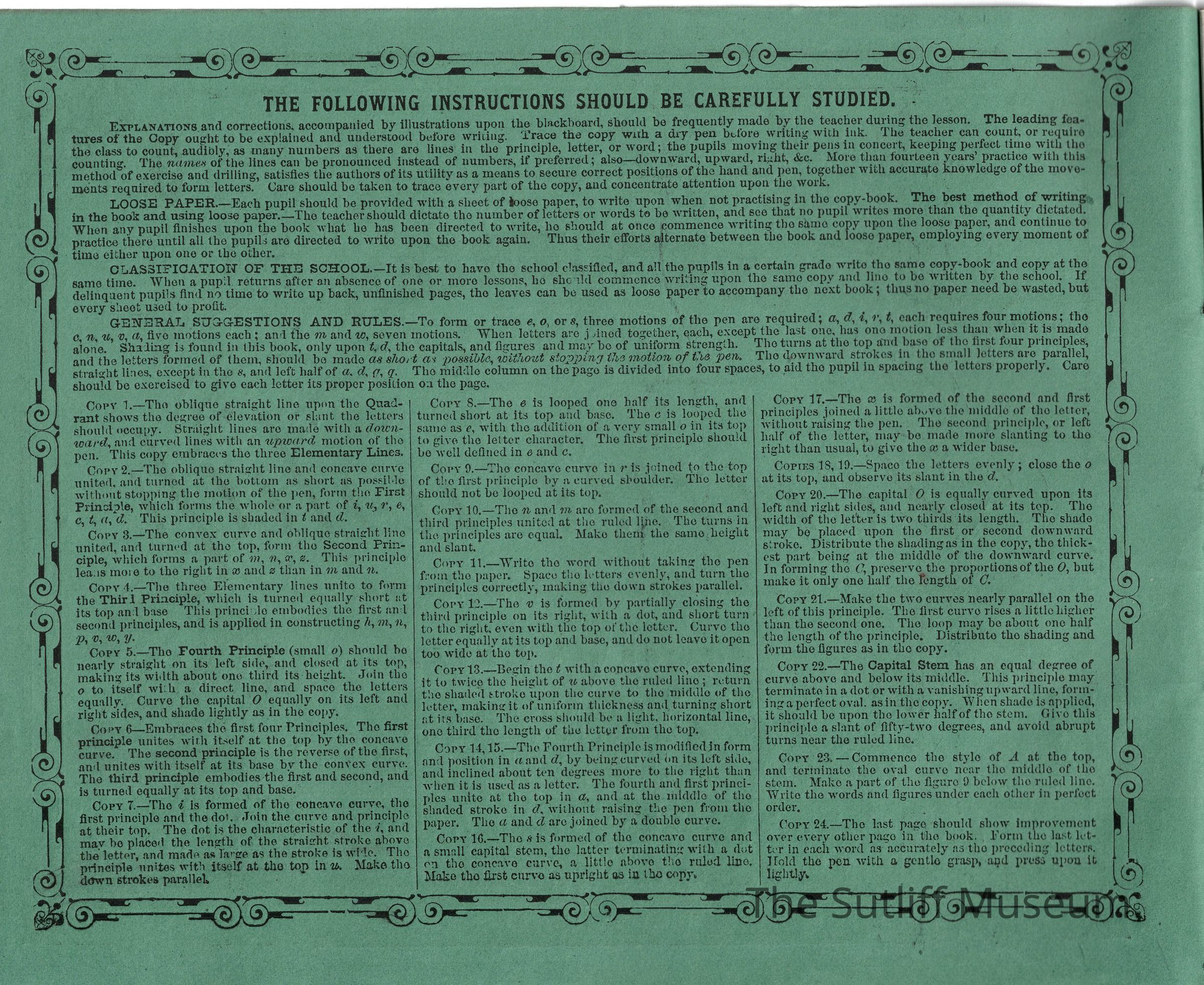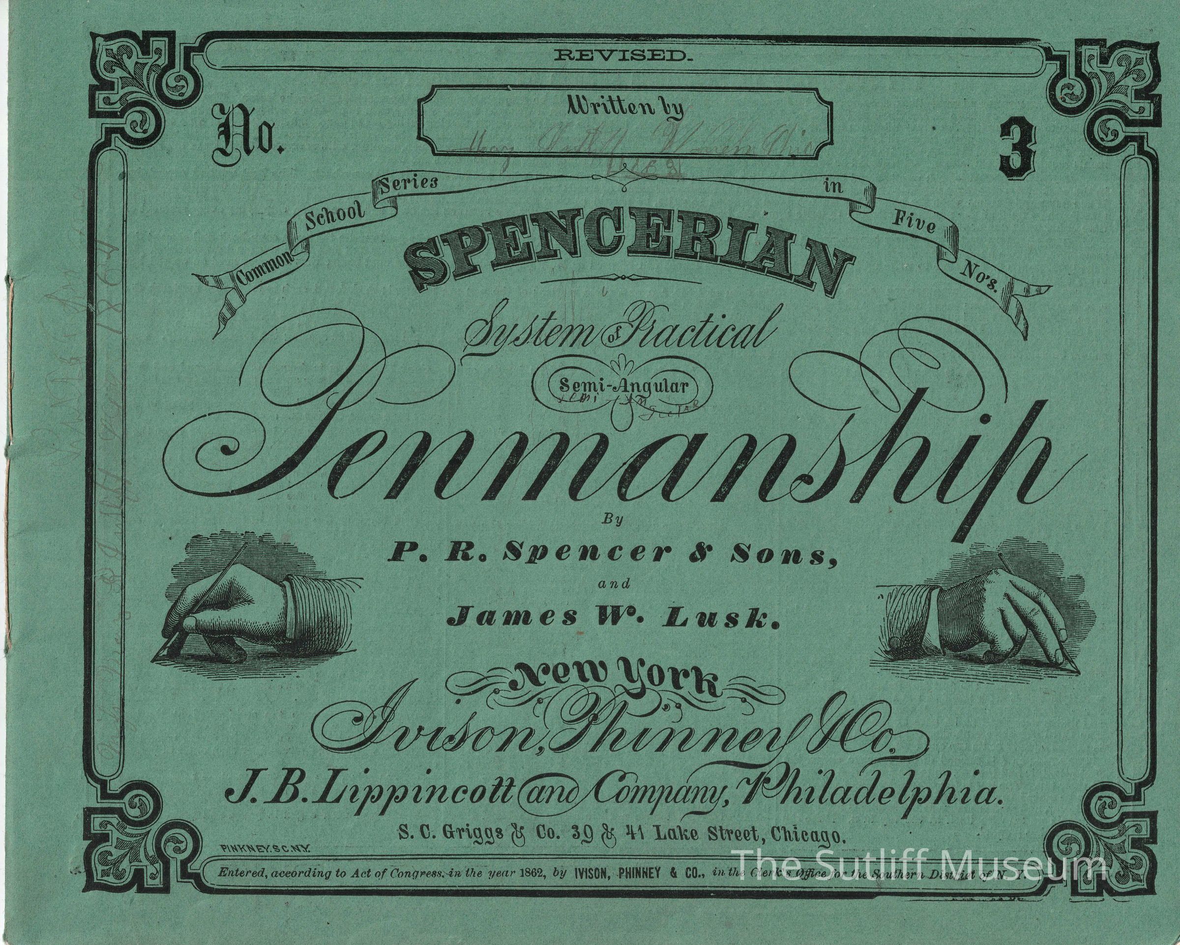 Spencerian System Practical Penmanship book. Green soft cover with decorative black border and black text. On front cover is rectangular box with space for students to place name. "Mary Ruth Sutliff Warren Ohio" has been handwriten in box and on side "Miss Mary R. Sutliff 1864." Book is only half filled.