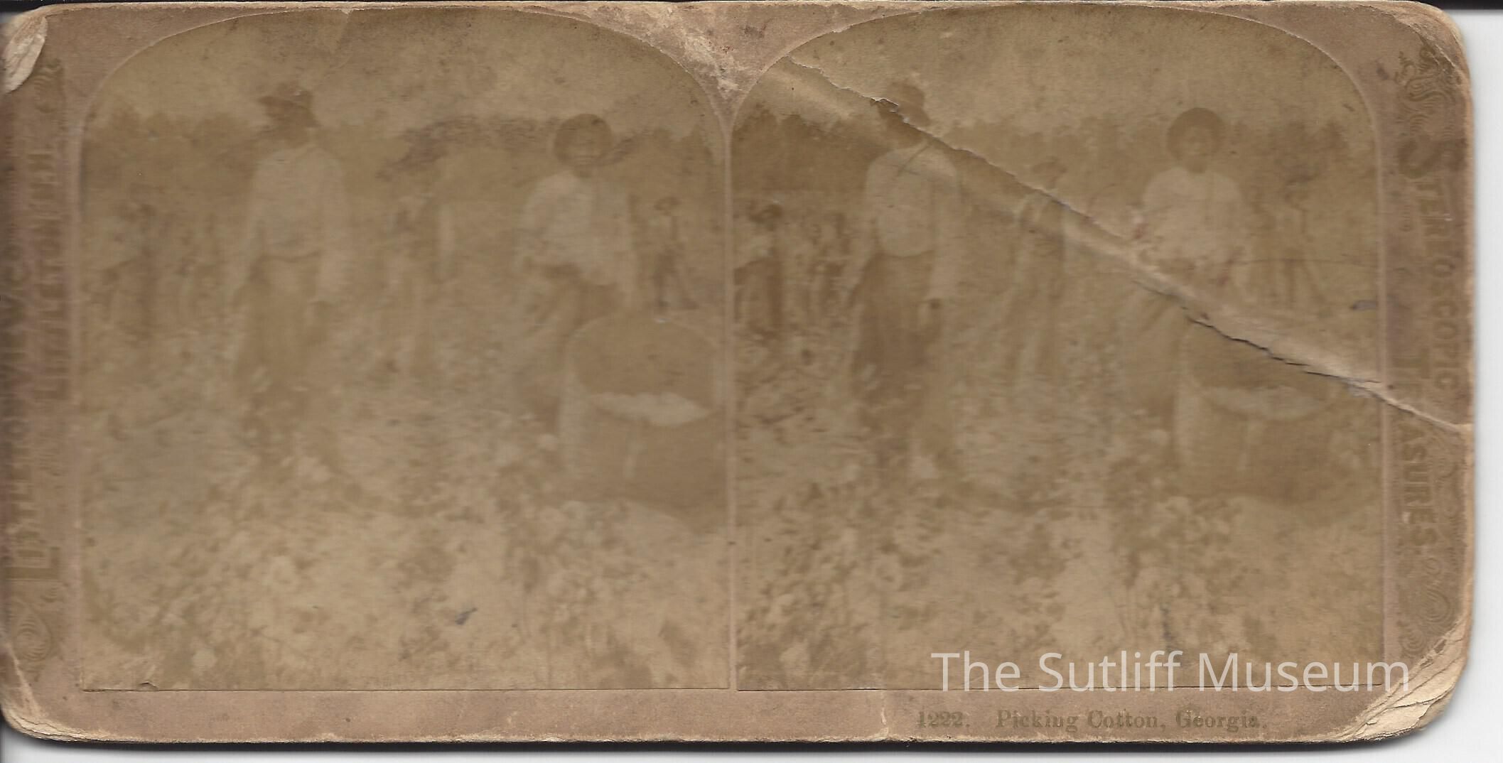 The item is a stereoscope card depicting 3 enslaved people picking cotton in Georgia. The title of the card is, "1222. Picking Cotton, Georgia."Collection