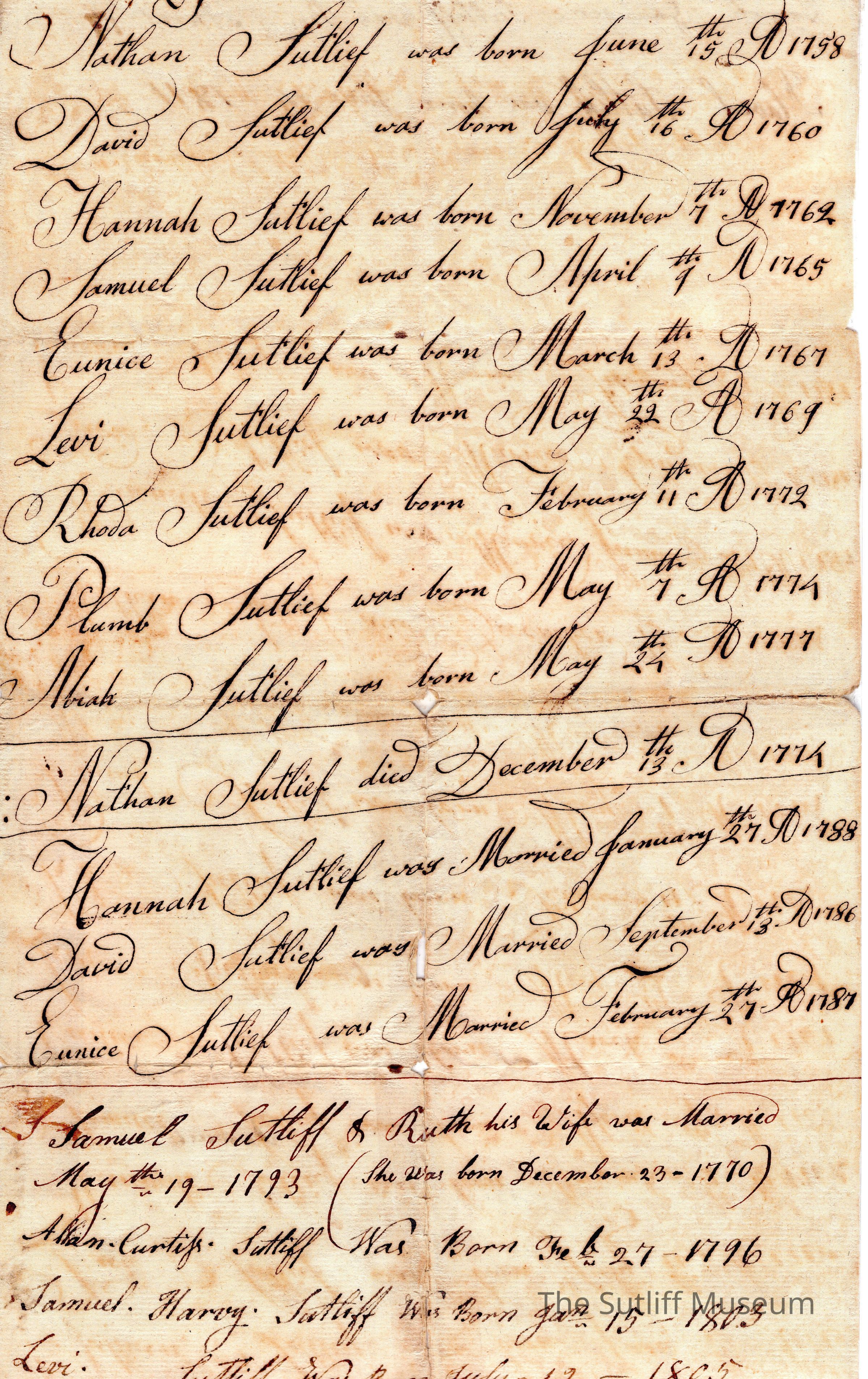 Sutliff, Nathan, Sutliff, David, Sutliff, Hannah Bennet, Sutliff, Samuel, Sutliff, Eunice Curtiss, Sutliff, Levi, Sutliff, Rhoda, Sutliff, Plumb, Sutliff, Ruth, Sutliff, Allen Curtis, Sutliff, Samuel Harvey, Sutliff, Milton, Sutliff, Calvin Granger, Sutliff, Flavel