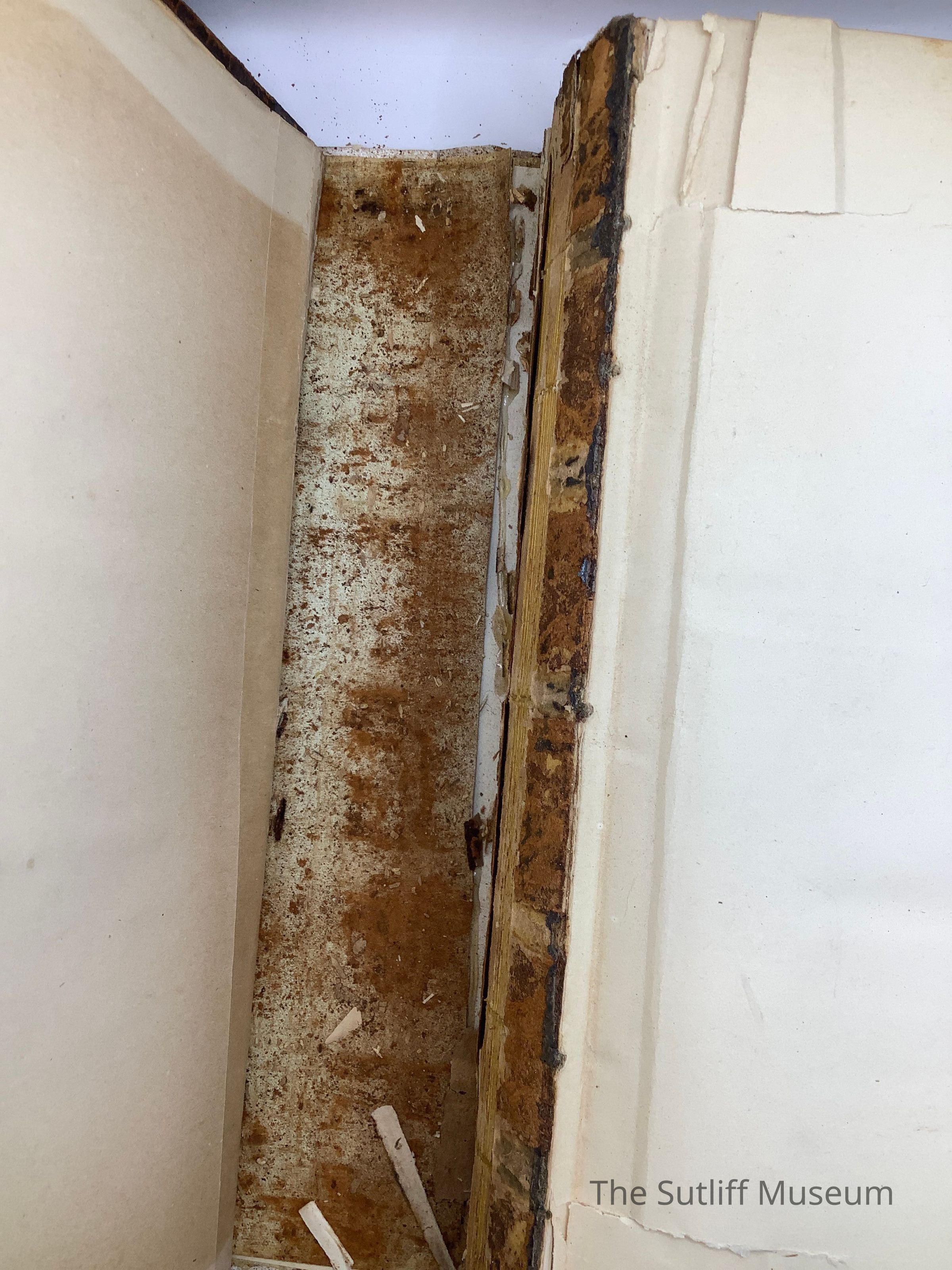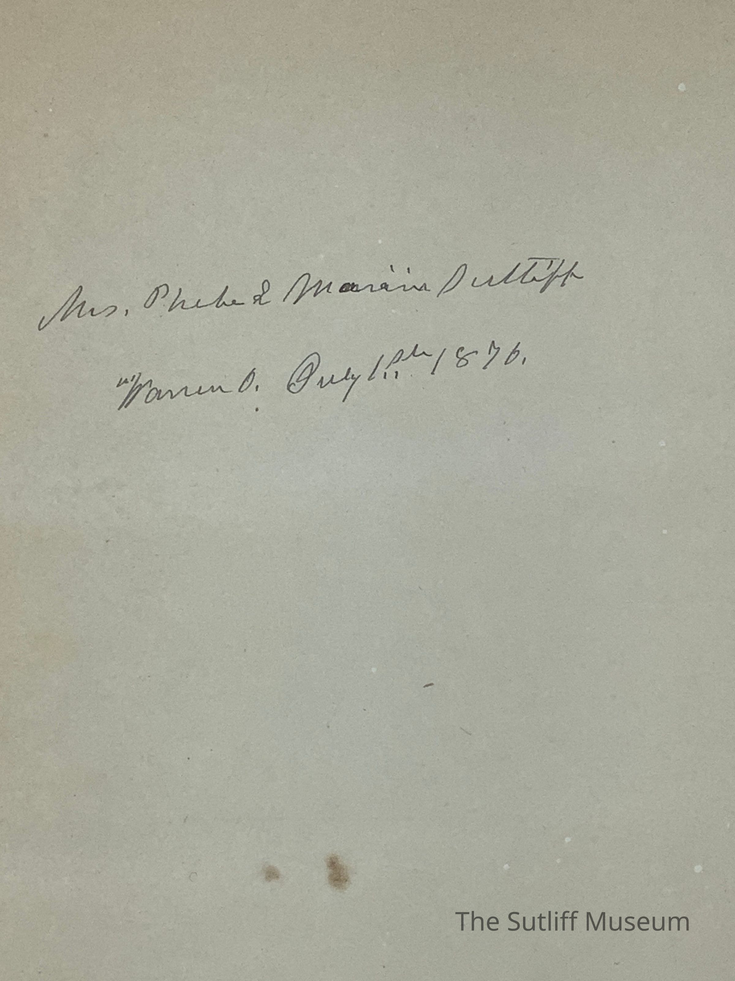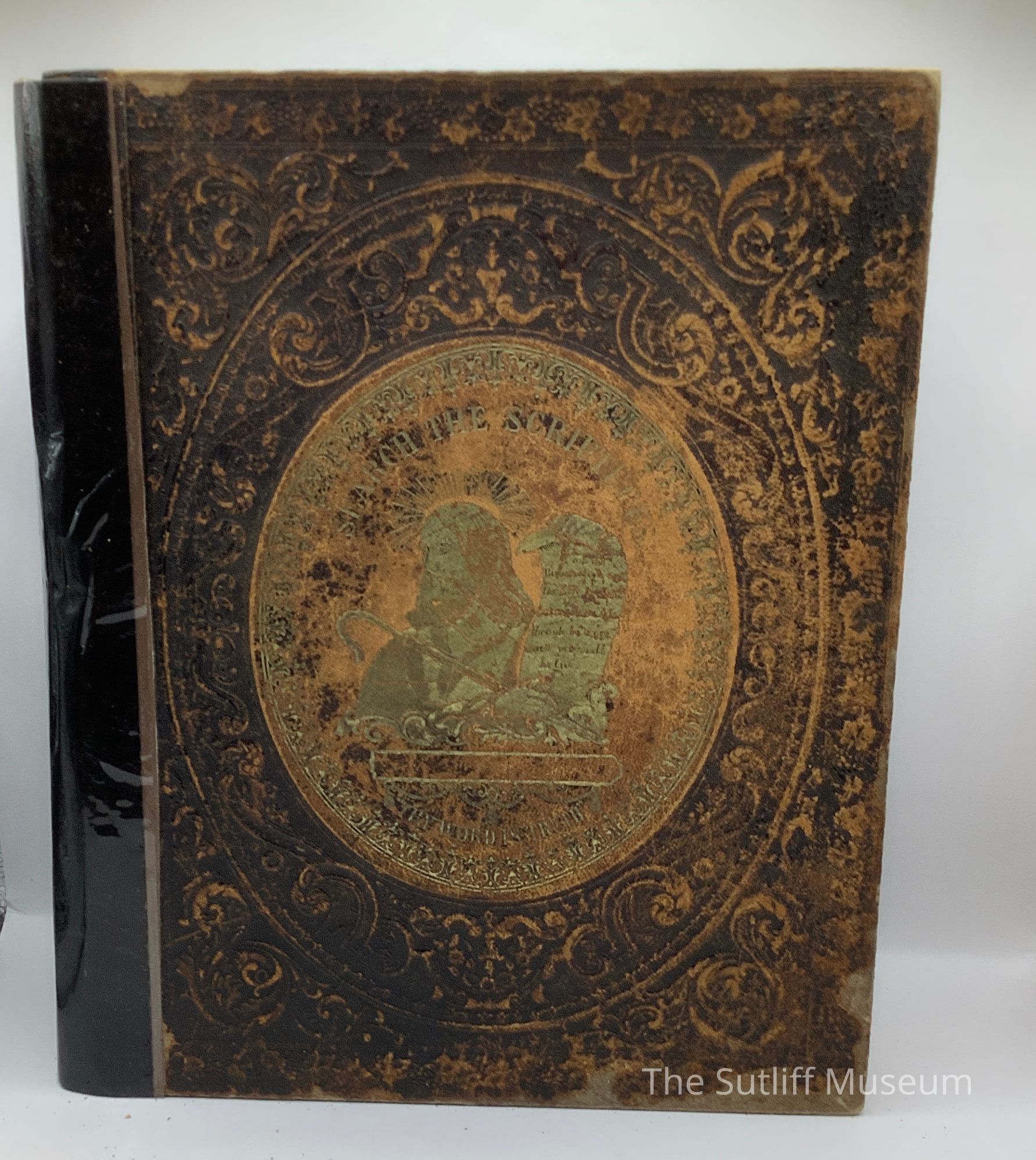 Tooled leather covers with damaged/repaired spine black tape. Front cover has gold embossed image of Jesus in oval with the words "Search the Scripture" arched over and "Thy Word is Truth" under. Image in oval on rear cover is of the young shepherd and lamb. Handwritten on second page in front "Mrs. Phebe L. Marvin Sutliff Warren, Ohio July 1st 1876. Birth, Death, and Marriage information written inside between Old and New Testaments. Gold leaf on page edges.Collection