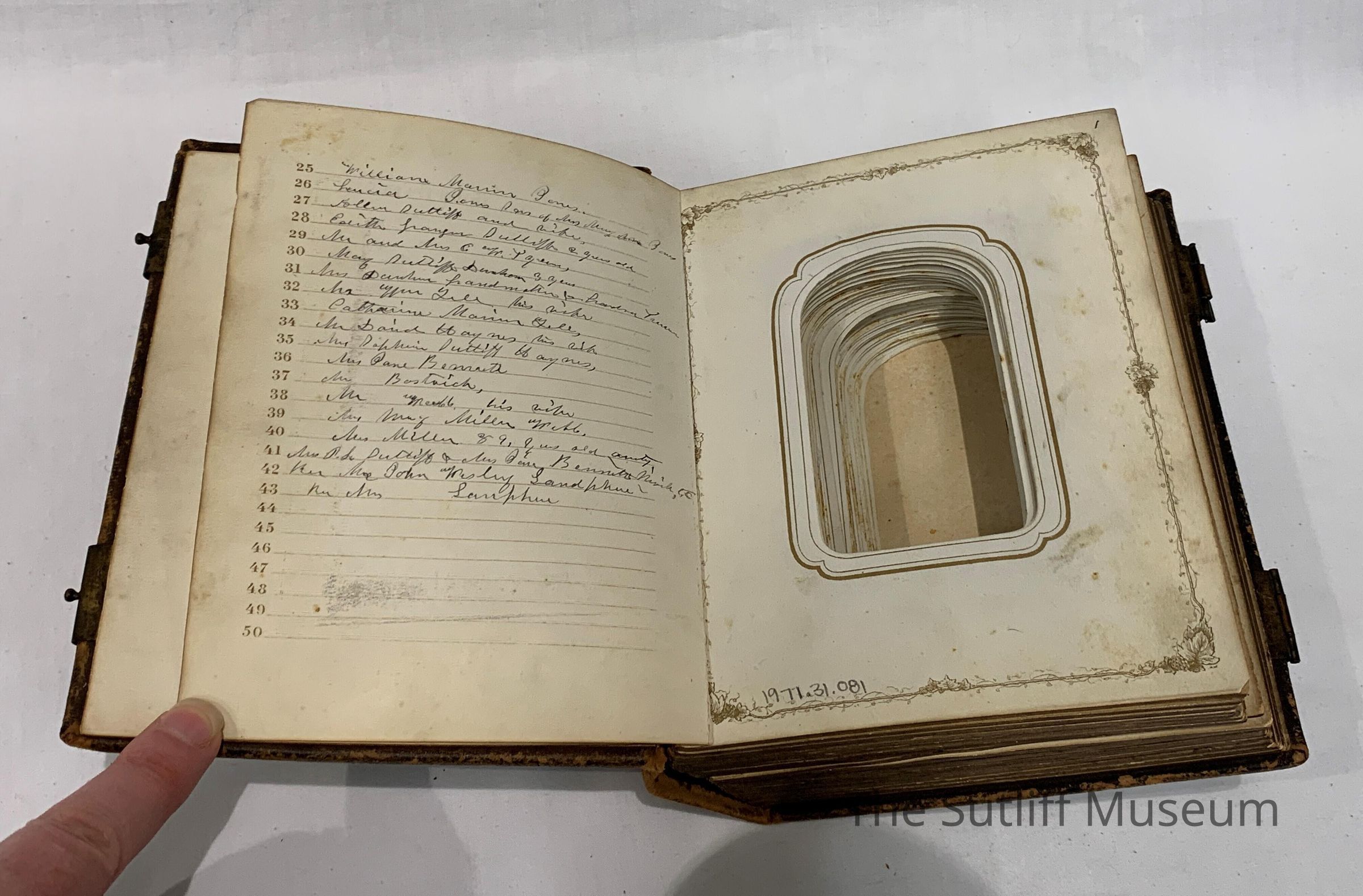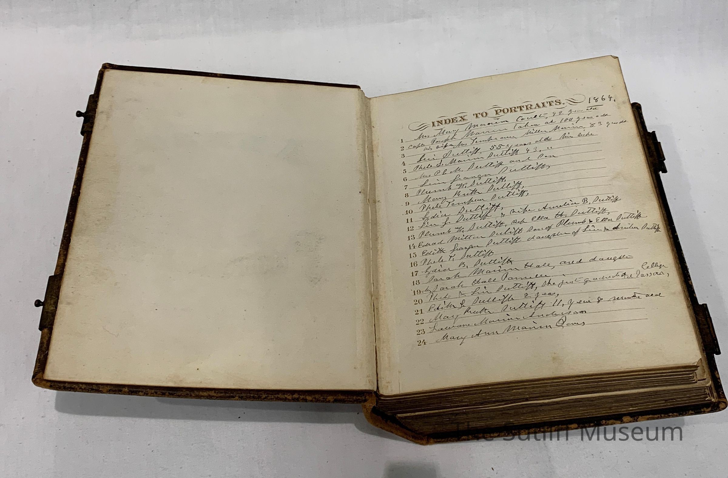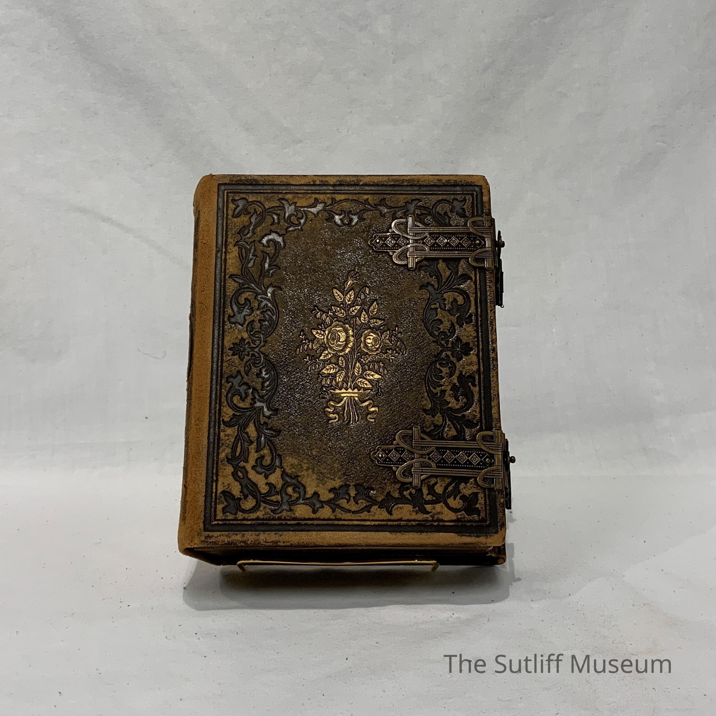 Sutliff Family Photo Album- Black and brown leather binding. Has scroll work and flowers on the covers. Brass hinge locks to close the album. Holds 50 photographs.