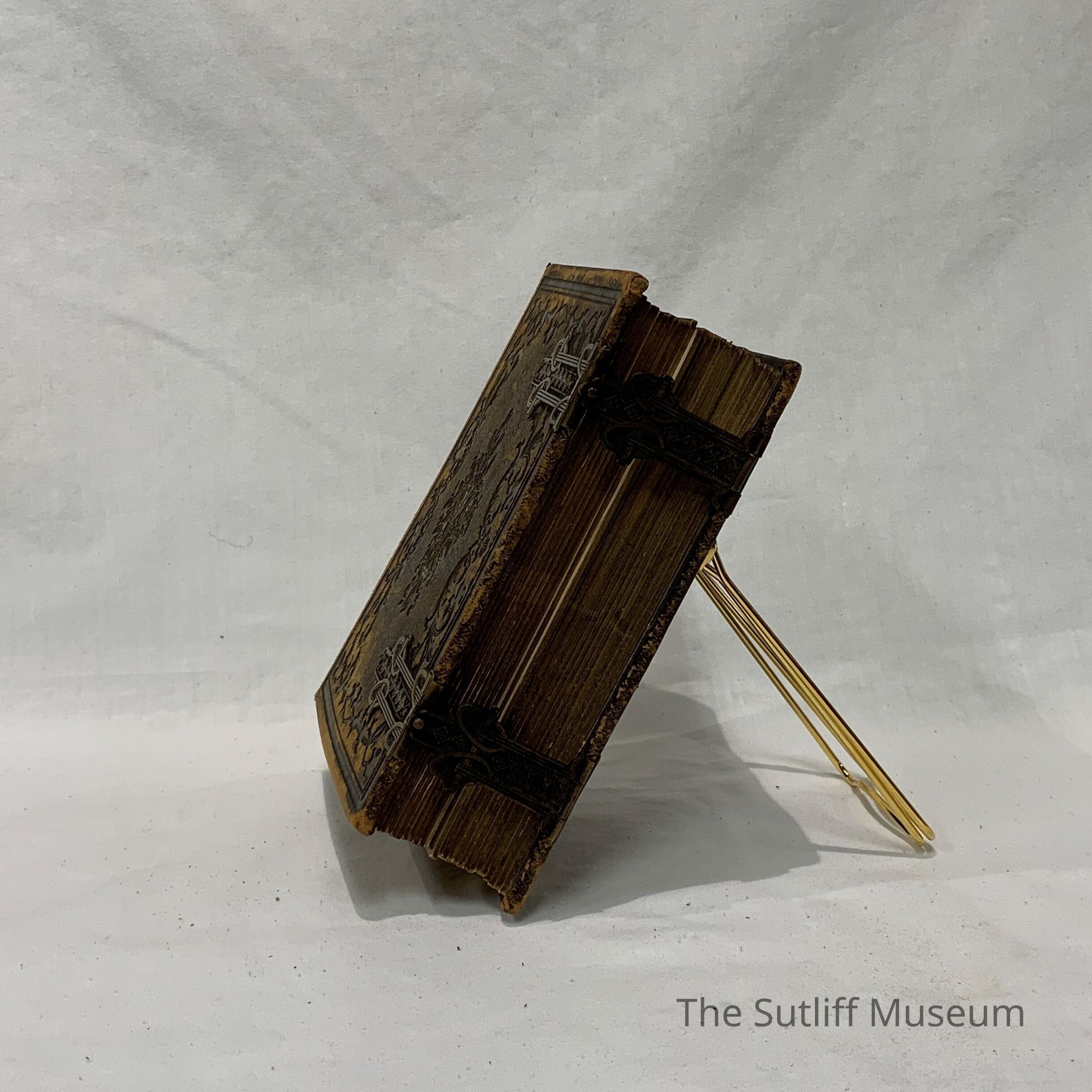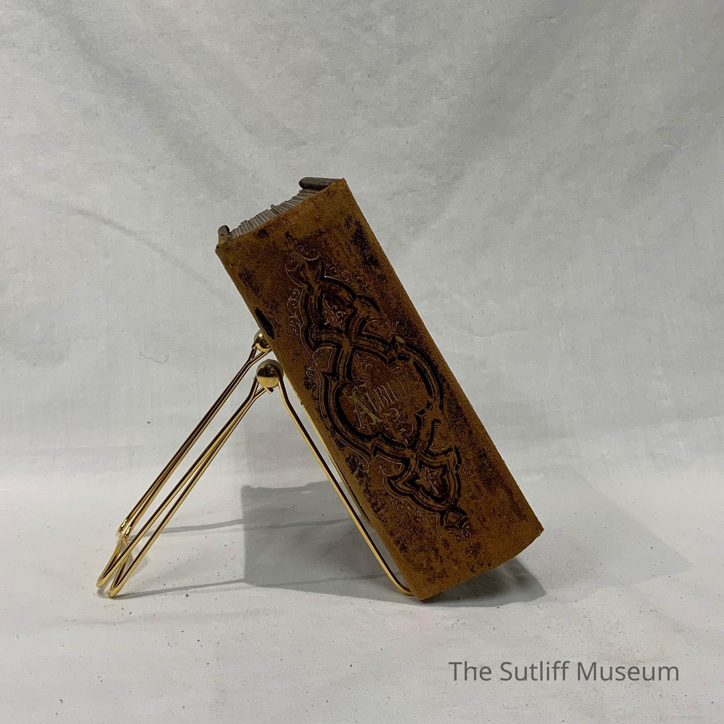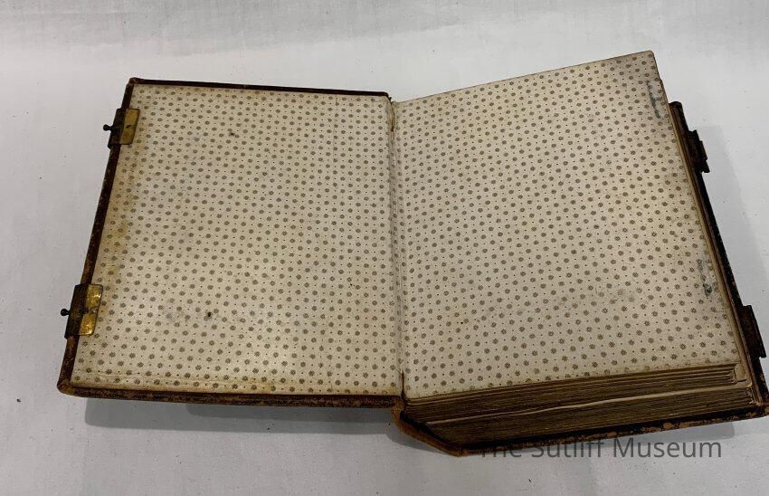 Sutliff Family Photo Album- Black and brown leather binding. Has scroll work and flowers on the covers. Brass hinge locks to close the album. Holds 50 photographs.