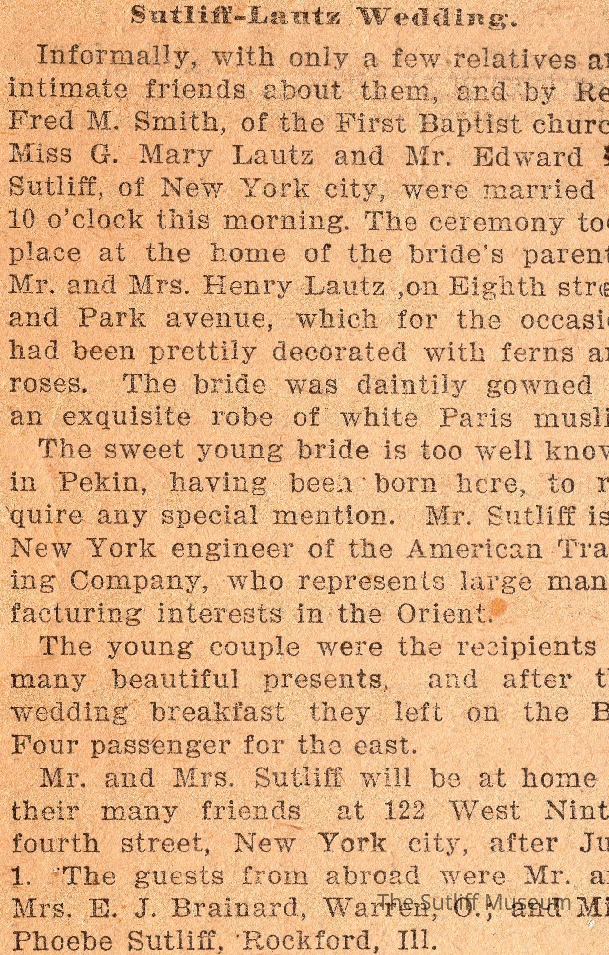 Newspaper clipping titled "Sutliff-Lautz Wedding" announcing the marriage of Mary Lautz and Edward Milton Sutliff.Collection